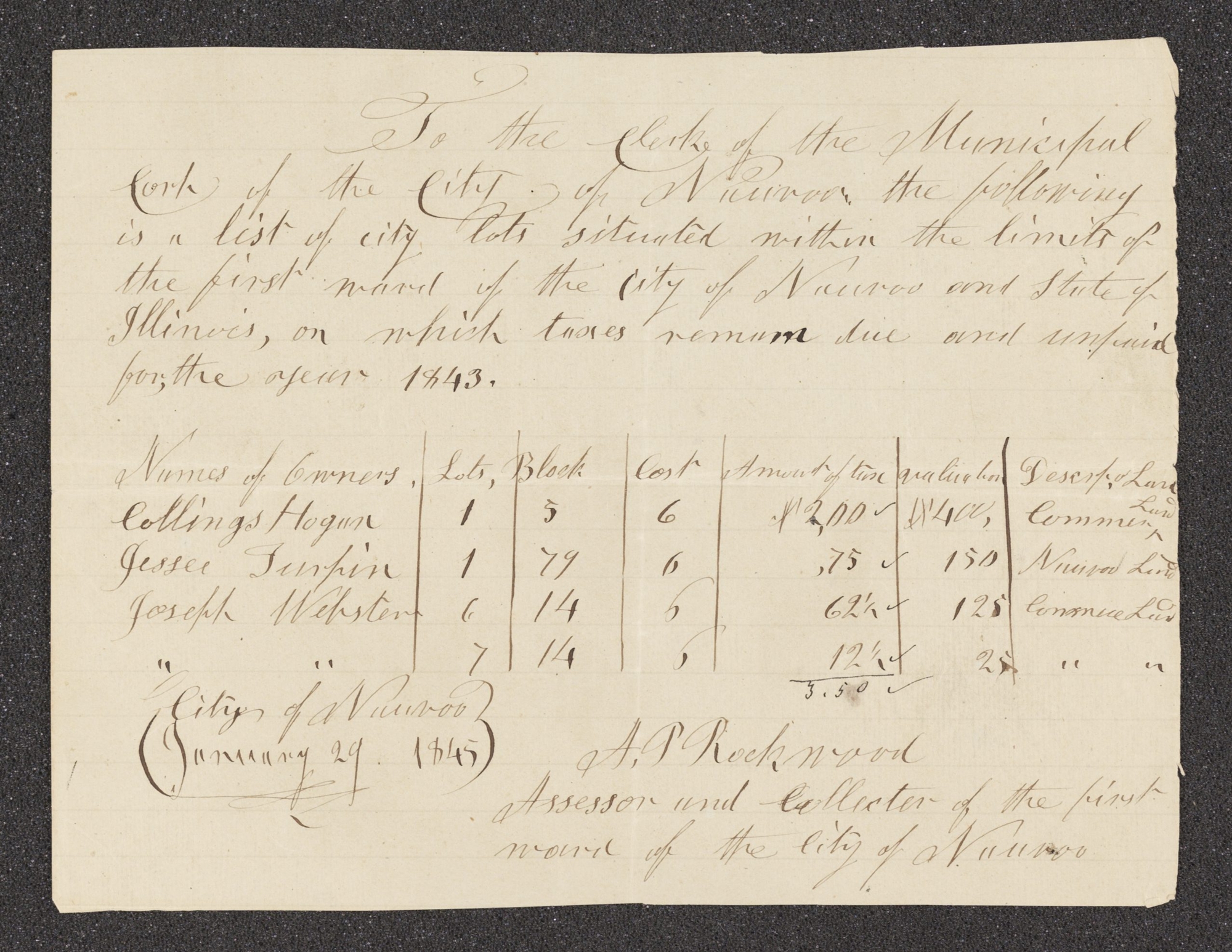 List of Delinquent Taxes for Real Property, Nauvoo First Ward for 1843, 29 January 1845