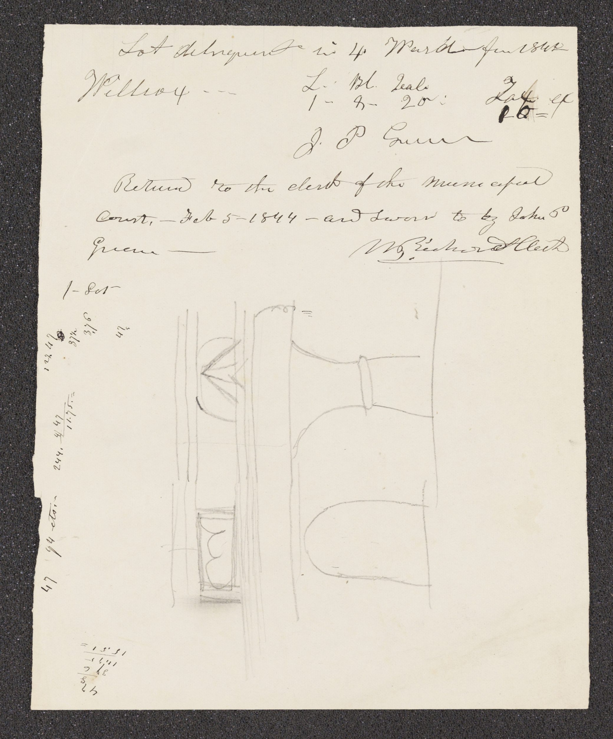 <Returnd to the clerk of the municipal Court.— Feb 5— 1844— and sworn to by —