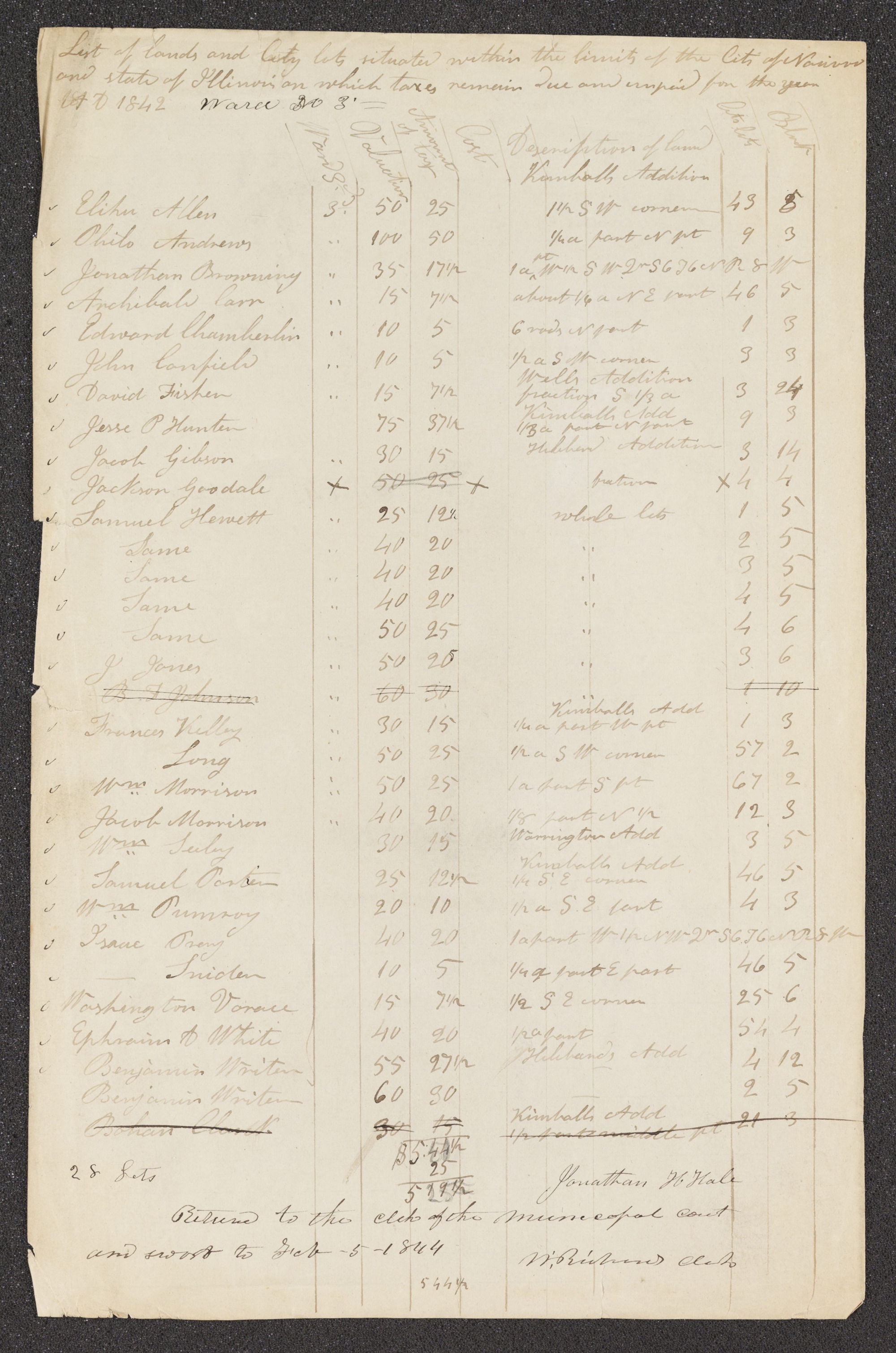, List of Delinquent Taxes for Real Property, third ward for 1842, , Hancock Co., IL, ca. Jan. 1844; handwriting of ; endorsed by , 5 Feb. 1844; notation in handwriting of ; one page; Nauvoo, IL, Records, 1841–1845, CHL.