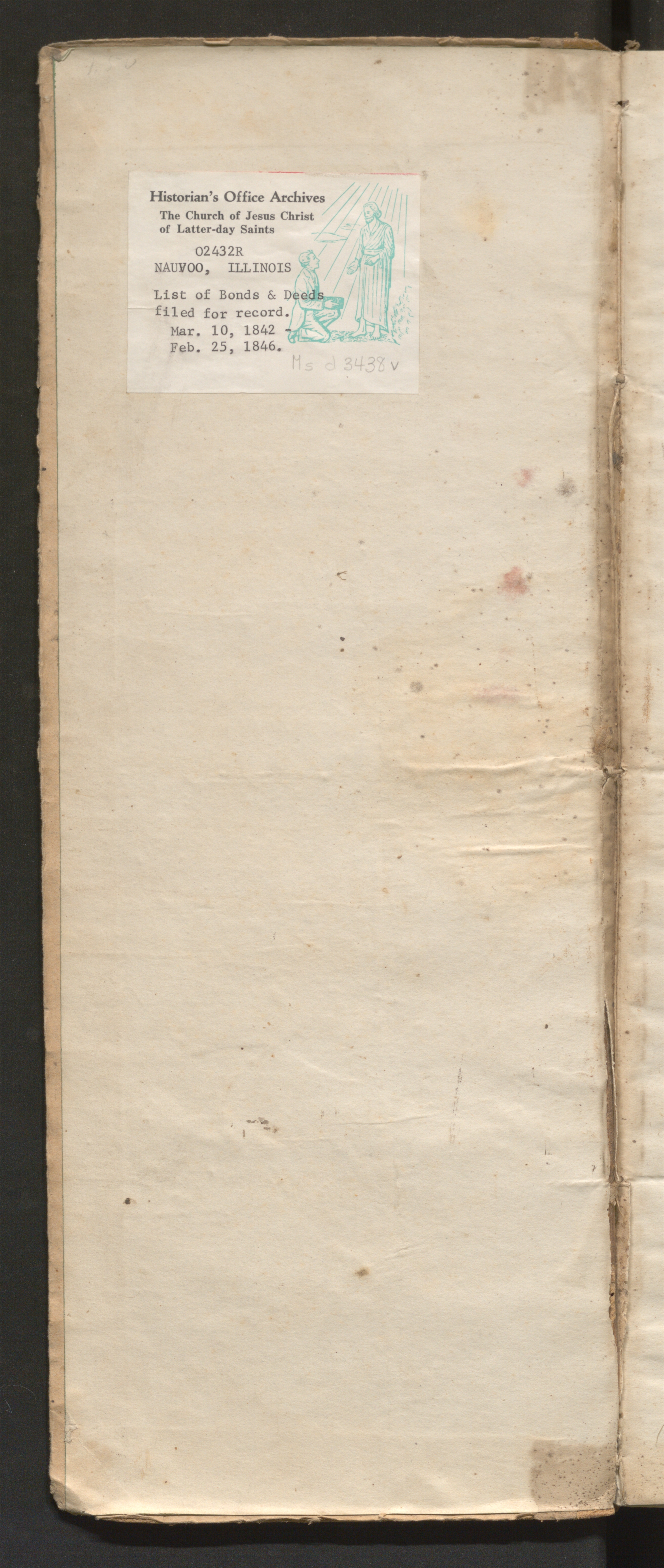 Nauvoo, Hancock Co., IL, Recorder, “List of Bonds & Deeds Filed for Record,” Nauvoo, Hancock Co., IL, ca. 28 April 1842–ca. 4 February 1846; handwriting of , , an unidentified scribe, , , and ; sixty-one unnumbered pages; CHL.