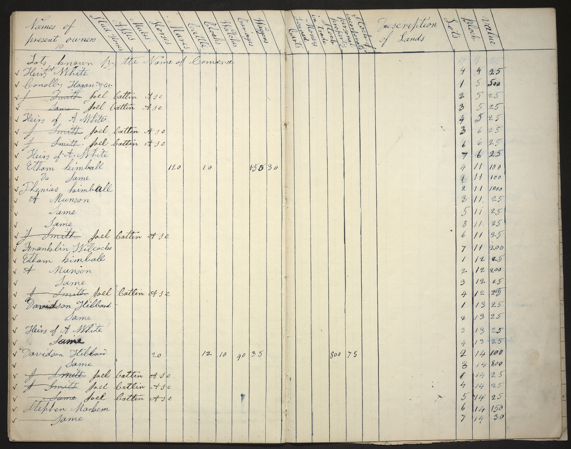 | Names of present owners | Stud Horses | Asses | Mules | Horses | Mares | Cattle | Clocks | Watches | Cariages | Waggons | Carts | Money Loaned | Stock in trade | personal property | Stock of incorporate co. | Description of Lands | Lots | Block | Value |