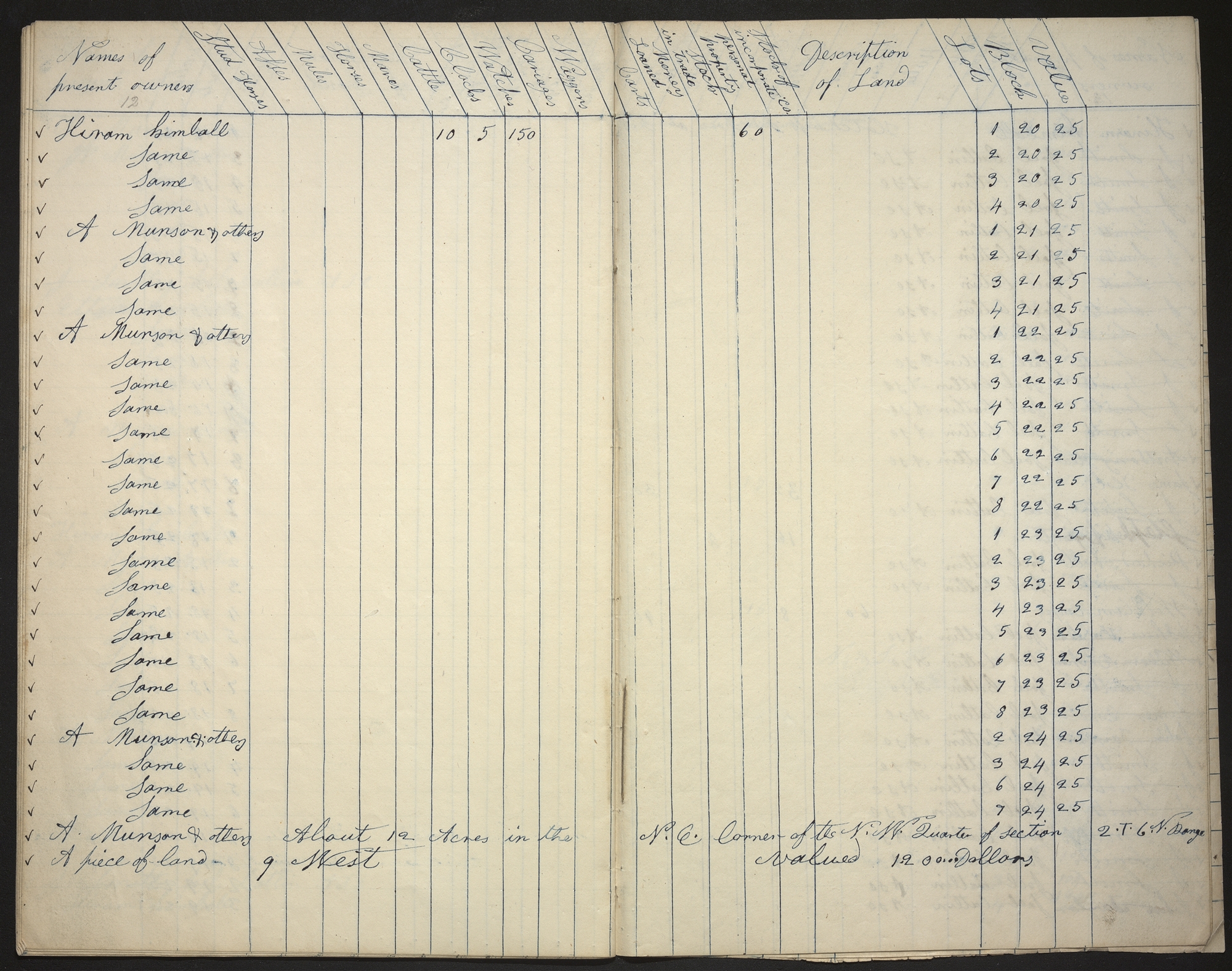 | <✓> A. Munson & others | <A piece of Land About 12 Acres in the N. E. Corner of the N. W. Quarter of Section 2 T 6 N Range 9 West valued 1,20000Dollars> |
