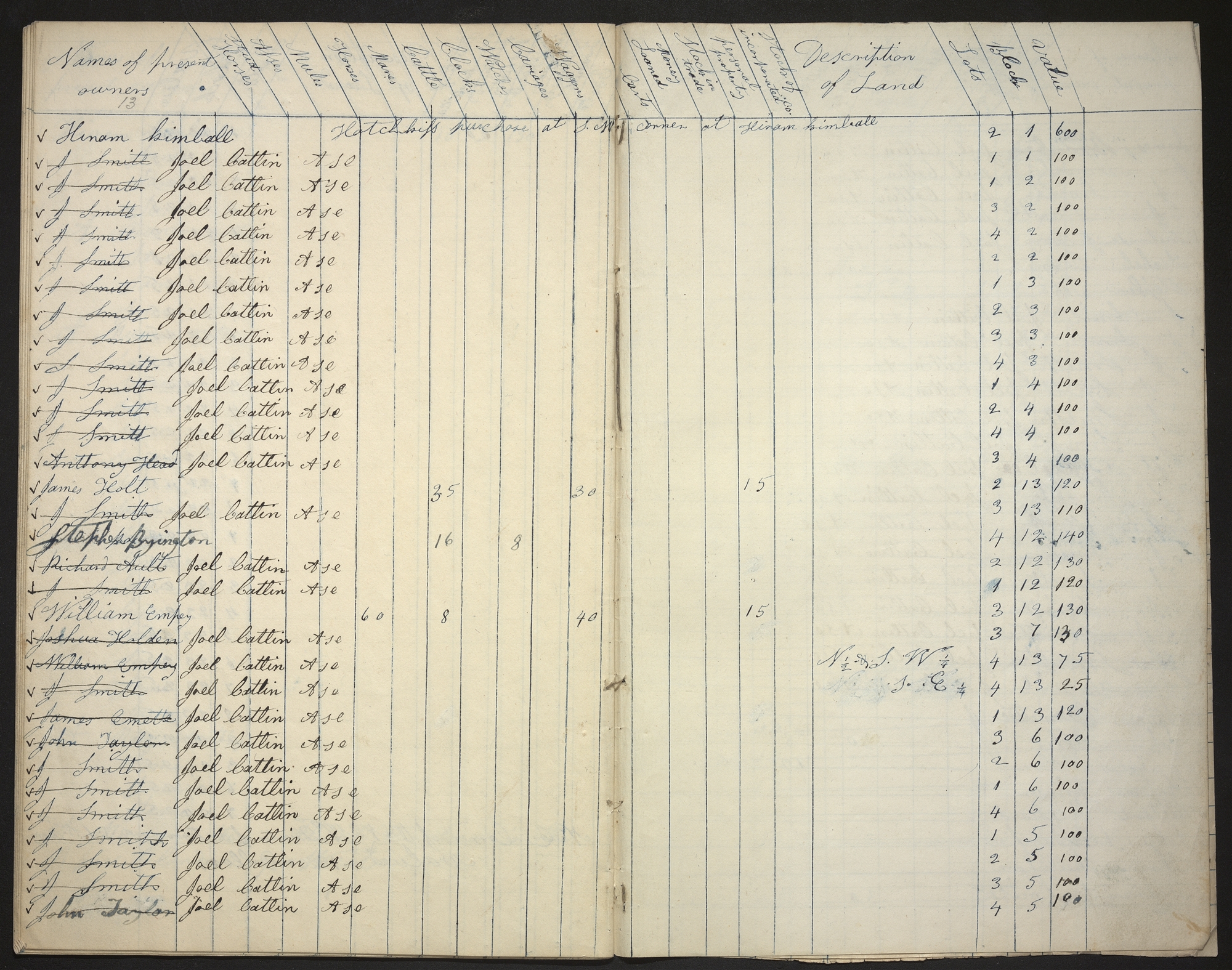 | Names of present owners | Stud Horses | Asses | Mules | Horses | Mares | Cattle | Clocks | Watches | Cariages | Waggons | Carts | Money Loaned | Stock in trade | Personal property | Stocks of incorporated co. | Description of Land | Lots | Blocks | Value |