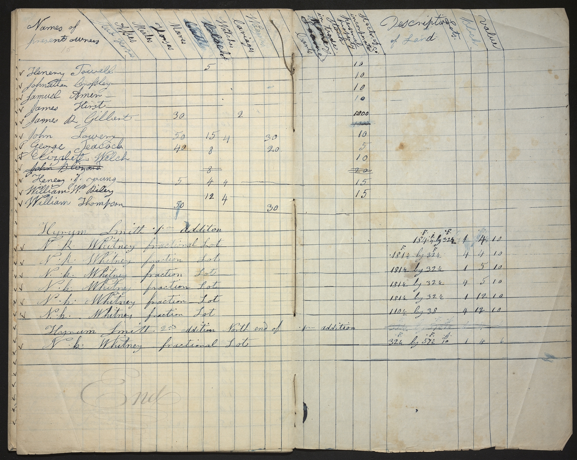 | Names of present owners | Stud Horses | Asses | Mules | Horses | Mares | Clocks <Cattle> | Watches <Clocks> | Watches | Cariages | Waggons | Carts | Stocks in trade <Money Loaned> | Stock in trade | Personal property | Stocks of incorporated co. | Description of Land | Lots | Block | Value |
