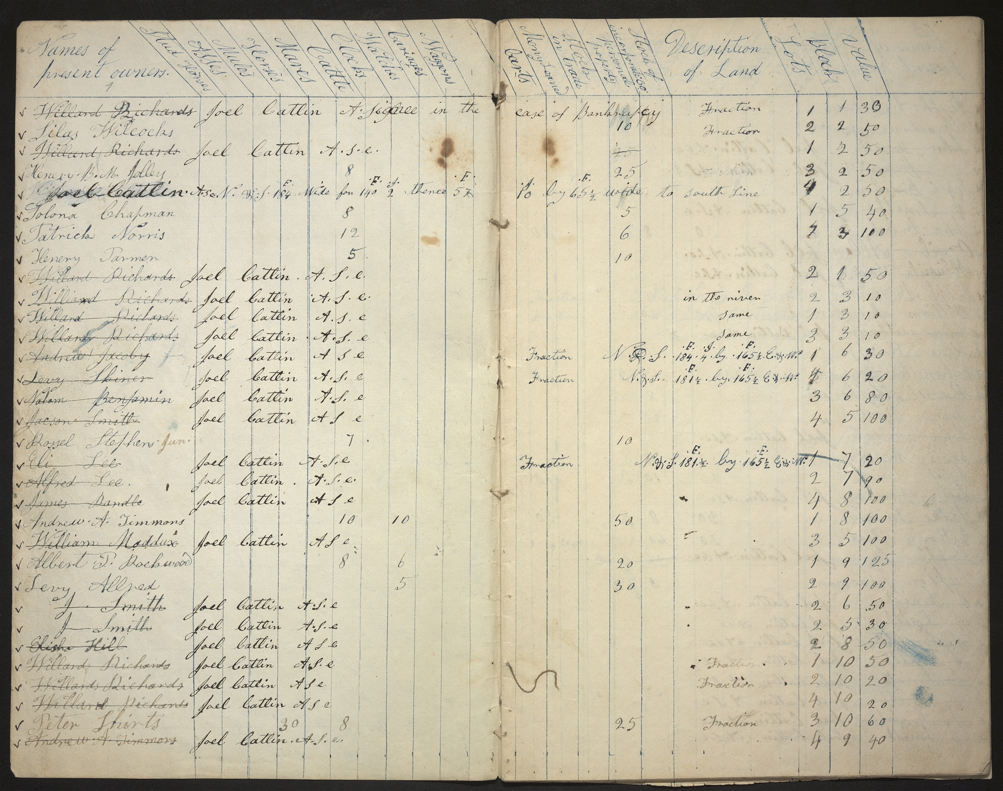 | Names of present owners. | Stud Horses | Asses | Mules | Horses | Mares | Cattle | Clocks | Watches | Cariages | Waggons | Carts | Mony Loaned | Stocks in trade | personal property | Stock of incorporate co. | Description of Land | Lots | Block | Value |