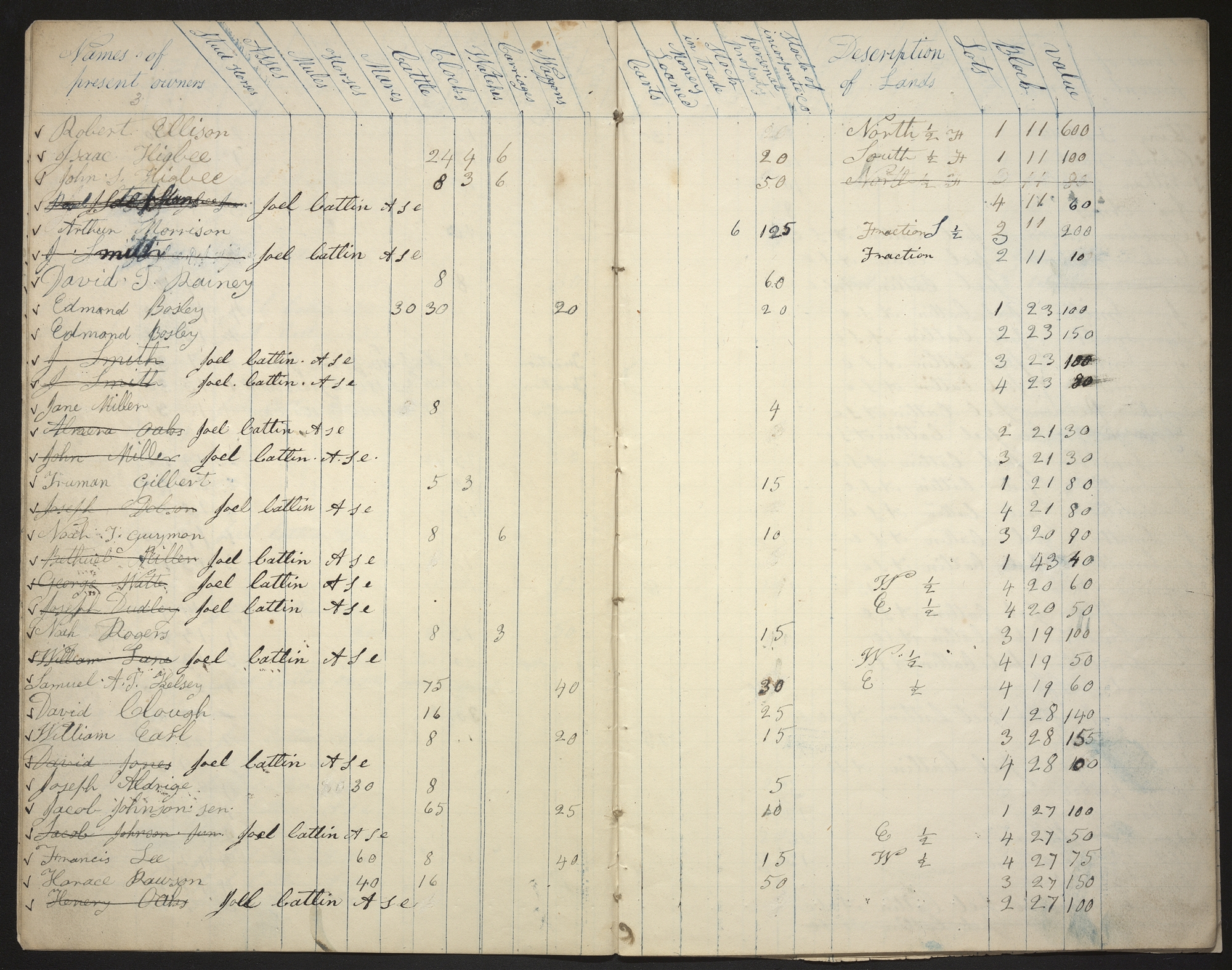 | Names of present owners | Stud Horses | Asses | Mules | Horses | Mares | Cattle | Clocks | Watches | Carriages | Waggons | Carts | Money Loaned | Stock in trade | personal property | Stocks of incorporate co. | Description of Lands | Lots | Block | Value |