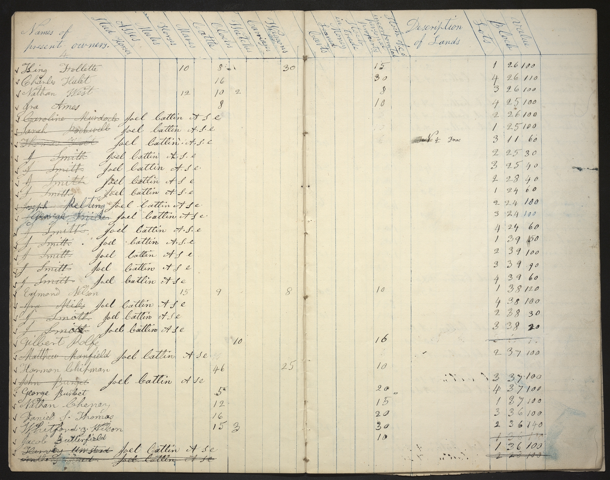 | Names of present owners. | Stud Horses | Asses | Mules | Horses | Mares | Cattle | Clocks | Watches | Carriages | Waggons | Carts | Money Loaned | Stock in trade | personal property | Stock of incorporated co. | Description of Lands | Lots | Block | Value |