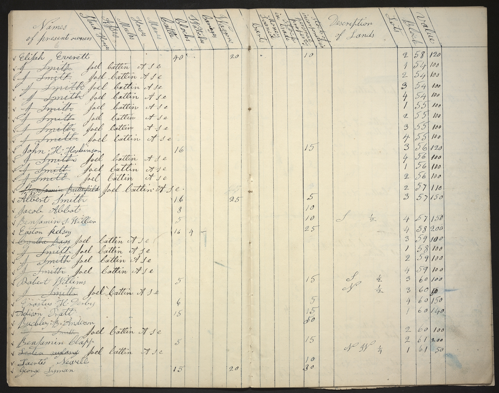 | Names of present owners | Stud Horses | Asses | Mules | Horses | Mares | Cattle | Clocks | Watches | Cariages | Waggons | Carts | Money Loaned | Stock in trade | Personal property | Stock of incorporate: co | Description of Lands | Lots | Blocks | Value |
