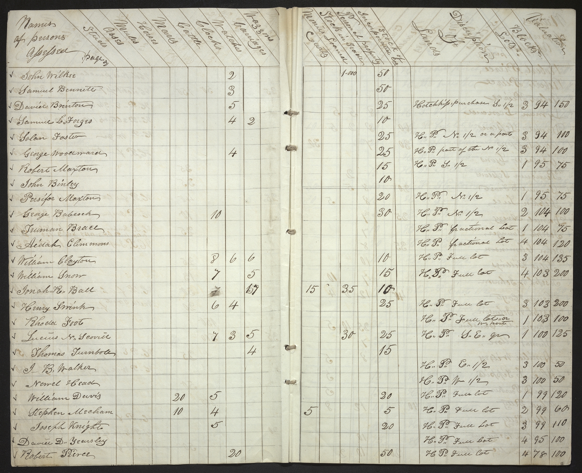 | Names of persons assessed <page 2> | Studs | Asses | Mules | Horses | Mares | Cattle | Clocks | Watches | Carriages | Waggons | Carts | Monies Loaned | Stock in Trade | Personal property | Stock of Incorporated cos | Description of Lands | Lots | Blocks | Valuation |