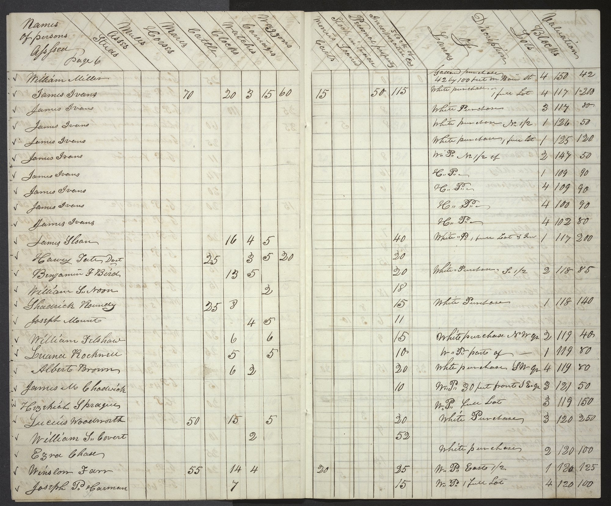 | Names of persons assessed <page 6> | Studs | Asses | Mules | Horses | Mares | Cattle | Clocks | Watches | Carrriages | Waggons | Carts | Monies Loaned | Stock in trade | Personal property | Stock of Incorporated cos | Description of Lands | Lots | Blocks | Valuation |