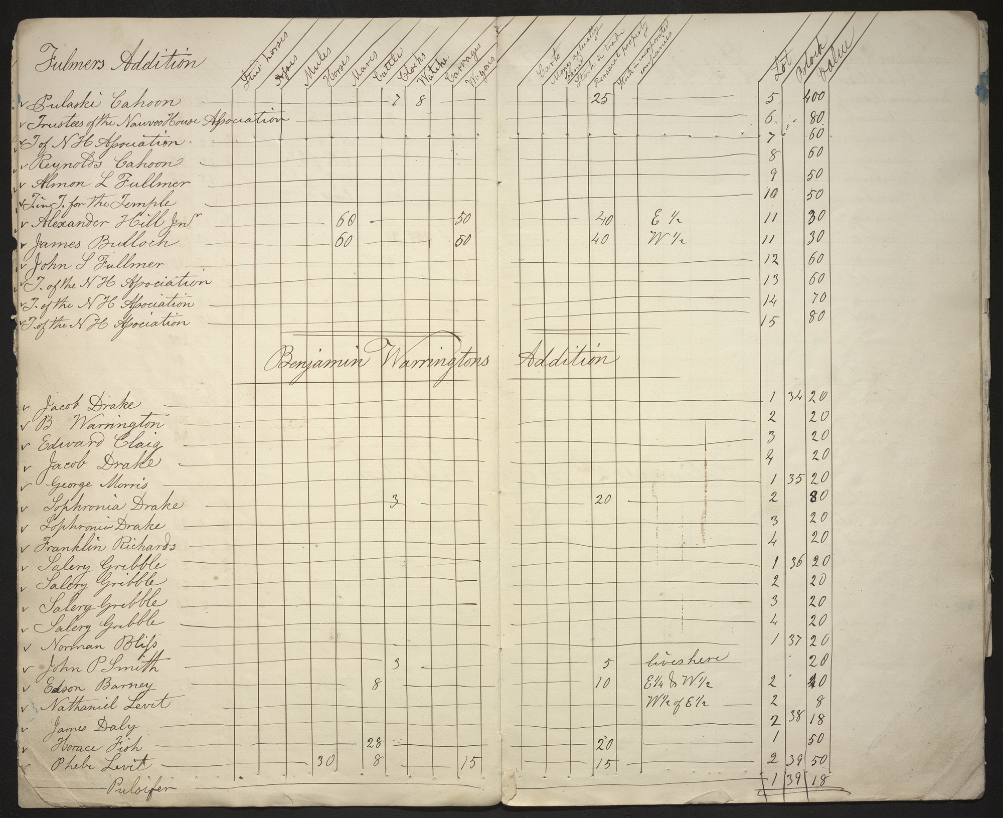 | Fulmers Addition | Stud horses | Asses | Mules | Horses | Mares | Cattle | Clocks | Watches | Carriages | Wagons | Carts | Money actually loaned | Stock in trade | Personal property | Stock in incorporated companies | Lot | Block | Value | |