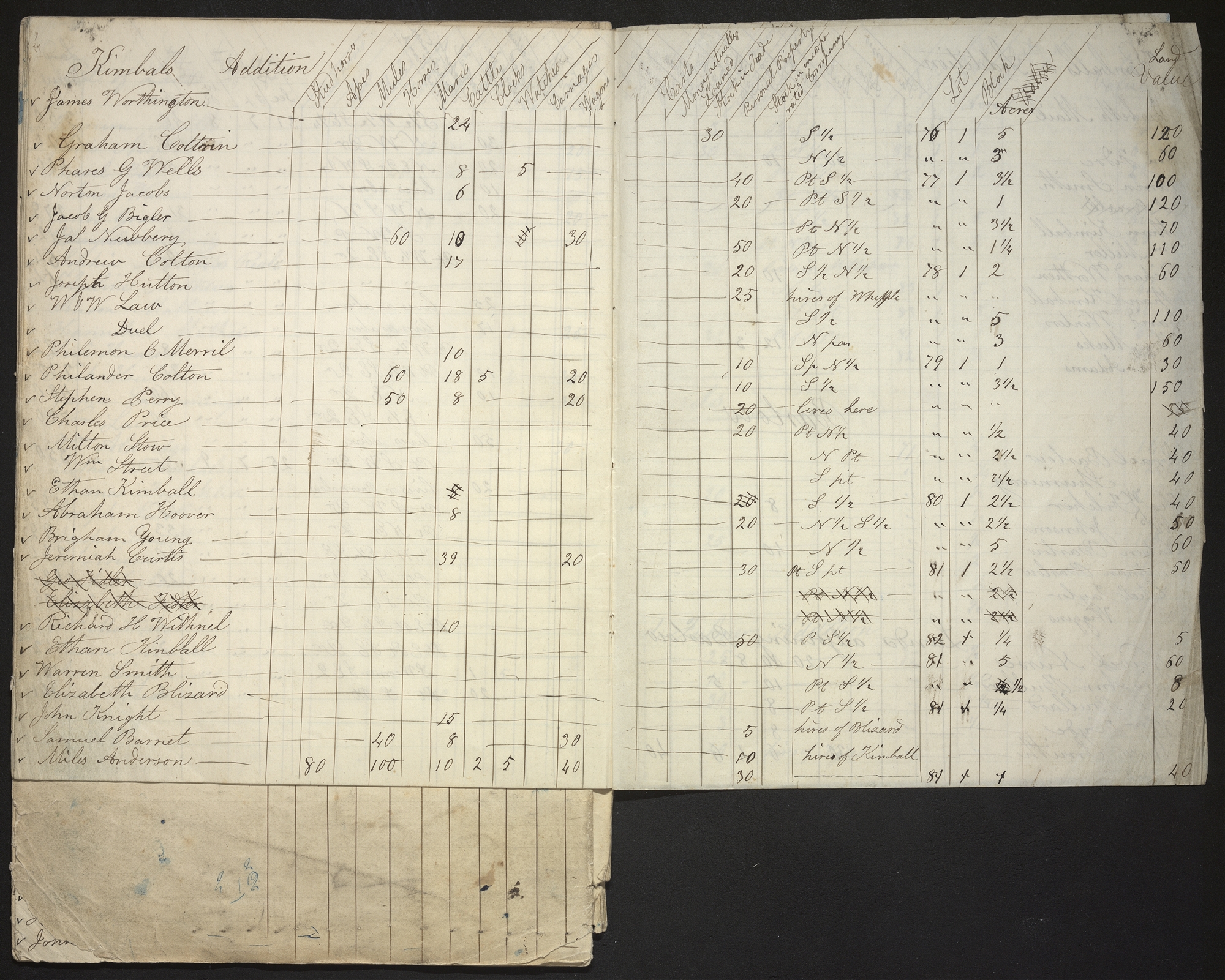 | Kimbal[l]s Addition | Stud horses | Asses | Mules | Horses | Mares | Cattle | Clocks | Watches | Carriages | Wagons | Carts | Money actually Loaned | Stock in Trade | Personal Property | Stock in incorporated Company | Lot | Block | Value Acres | Land Value | |