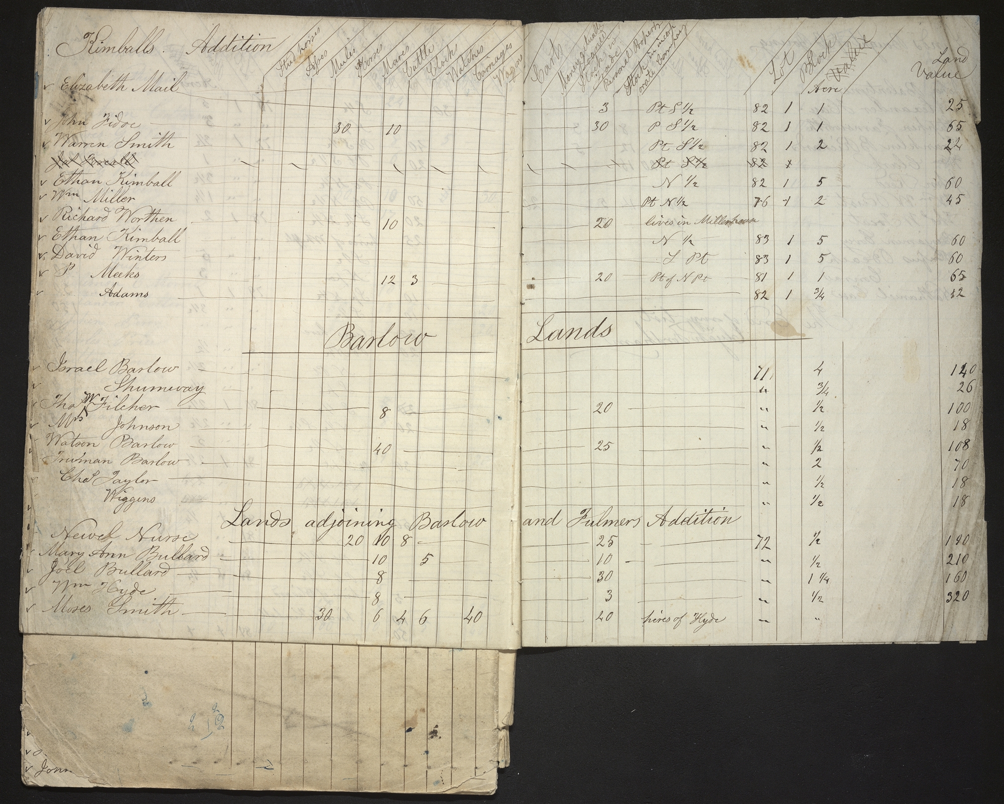 | Kimballs Addition | Stud horses | Asses | Mules | Horses | Mares | Cattle | Clocks | Watches | Carriages | Wagons | Carts | Money actually Loaned | Stock in Trade | Personal Property | Stock in incorporate Company | Lot | Block | Value Acre | Land Value | |