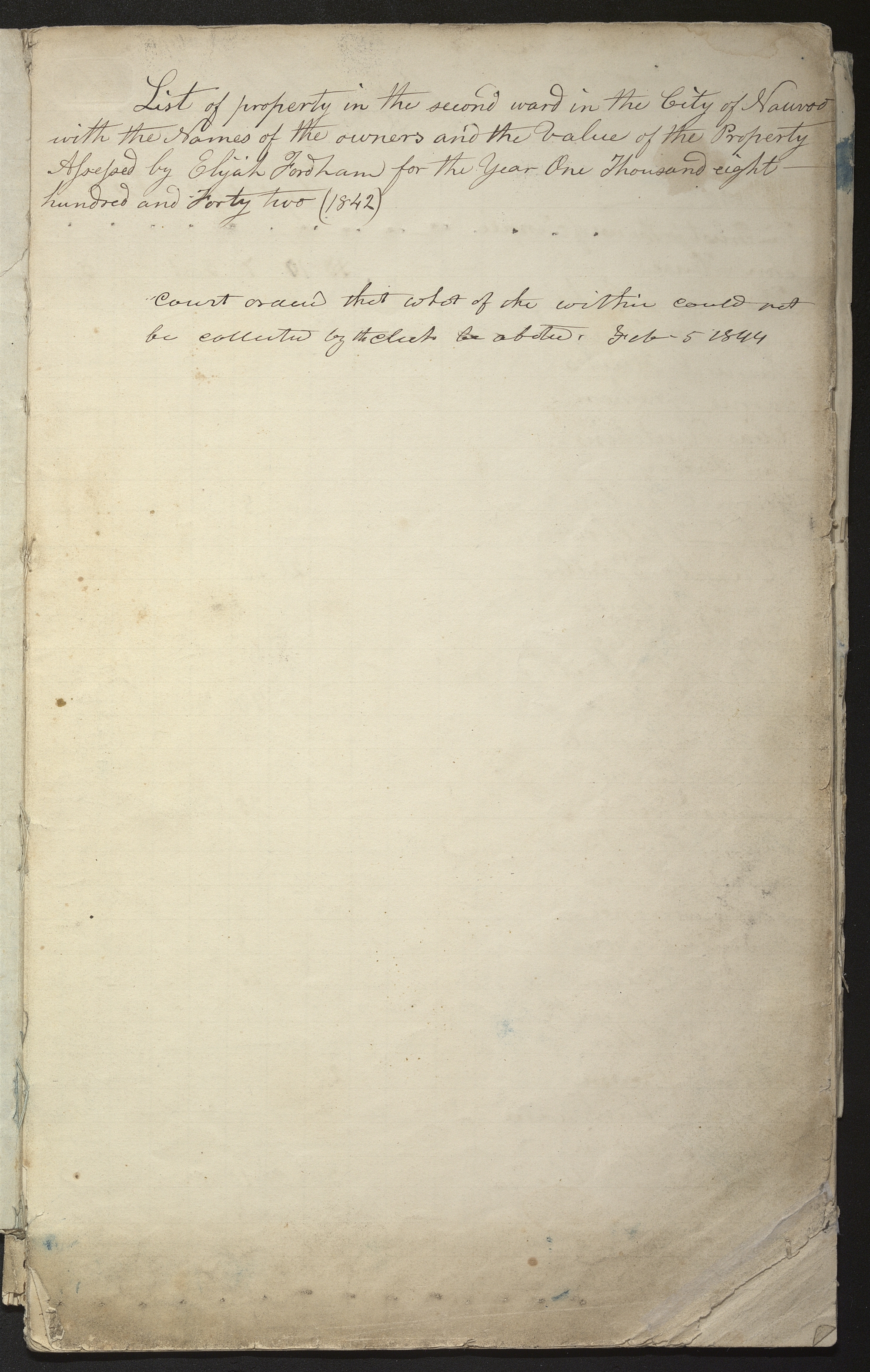 , List of Property in second ward, 1842, , Hancock Co., IL; inscribed [ca. 16 Nov. 1842–ca. 22 Feb. 1843]; handwriting of , and ; eighteen pages; Nauvoo, IL, Records, 1841–1845, CHL.