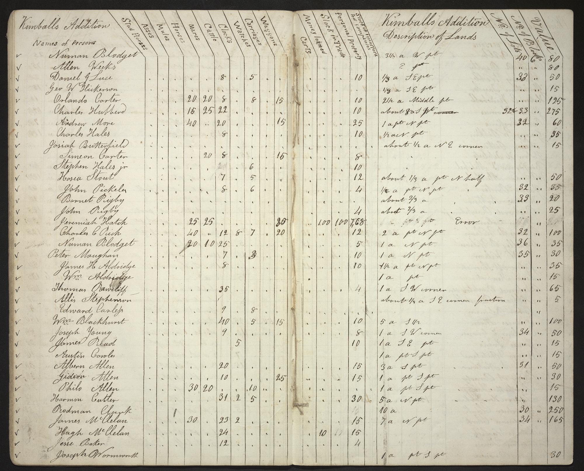 | Kimballs Addition Names of Persons | Stud Horses | Asses | Mules | Horses | Mares | Cattle | Clocks | Watches | Carriages | Waggons | Carts | Money loaned | Stock in Trade | Personal Property | Stock of incorporated companies | Kimballs Addition Description of Lands | No of Lots | No of Blocks | Value |