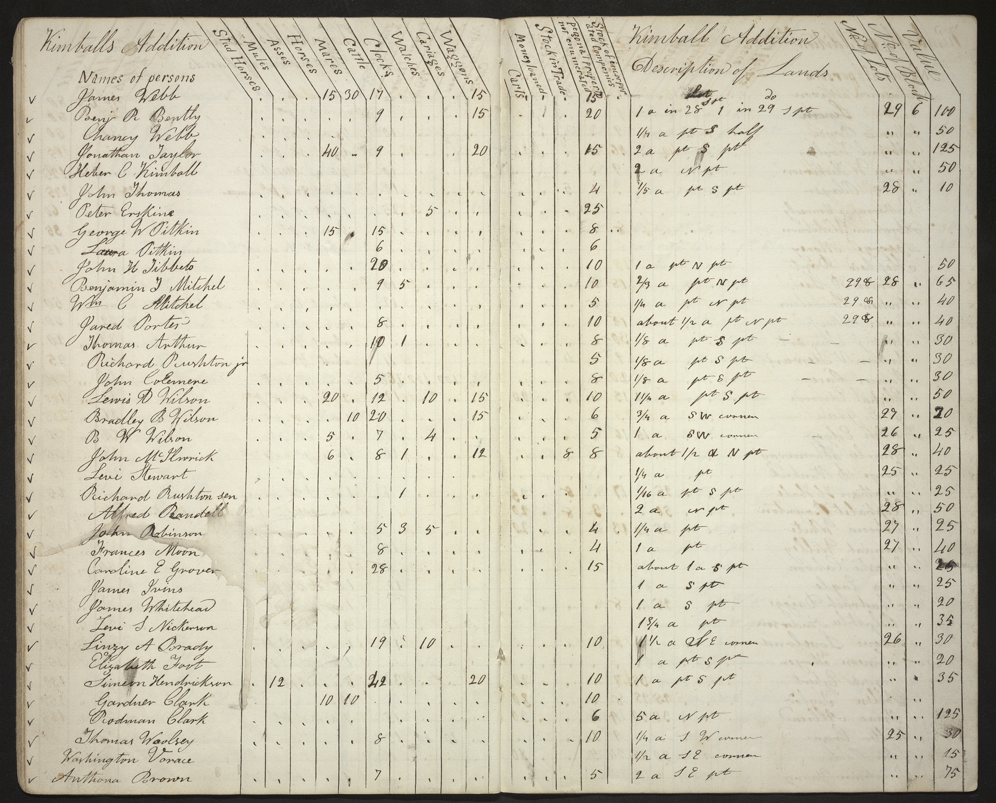 | Kimballs Addition Names of persons | Stud Horses | Mules | Asses | Horses | Mares | Cattle | Clocks | Watches | Cariages | Waggons | Carts | Money loaned | Stock in Trade | Personal Property not enumerated | Stock of incorporated Componies | Kimball Addition Description of Lands | No of Lots | No of Block | Value |