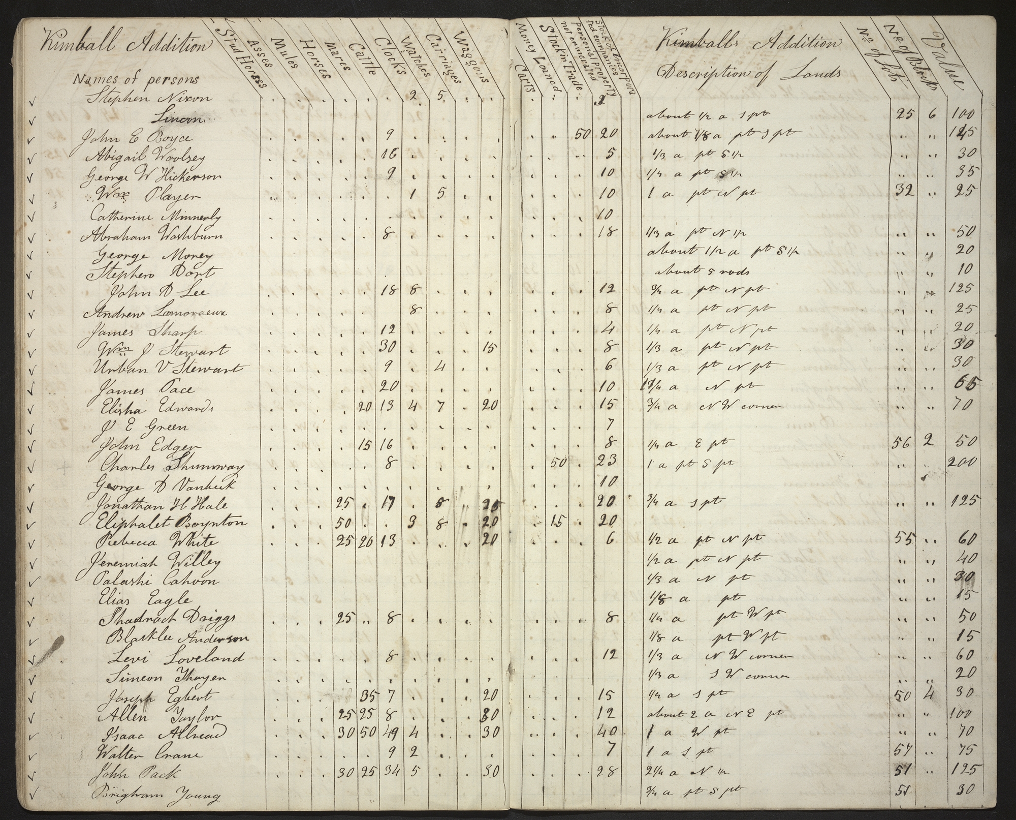 | Kimball Addition Names of persons | Stud Horses | Asses | Mules | Horses | Mares | Cattle | Clocks | Watches | Carriages | Waggons | Carts | Money Loaned | Stock in Trade | Personal Property not enmerated | Stock of Incorporated companies | Kimballs Addition Description of Lands | No. of Lots | No. of Blocks | Value |