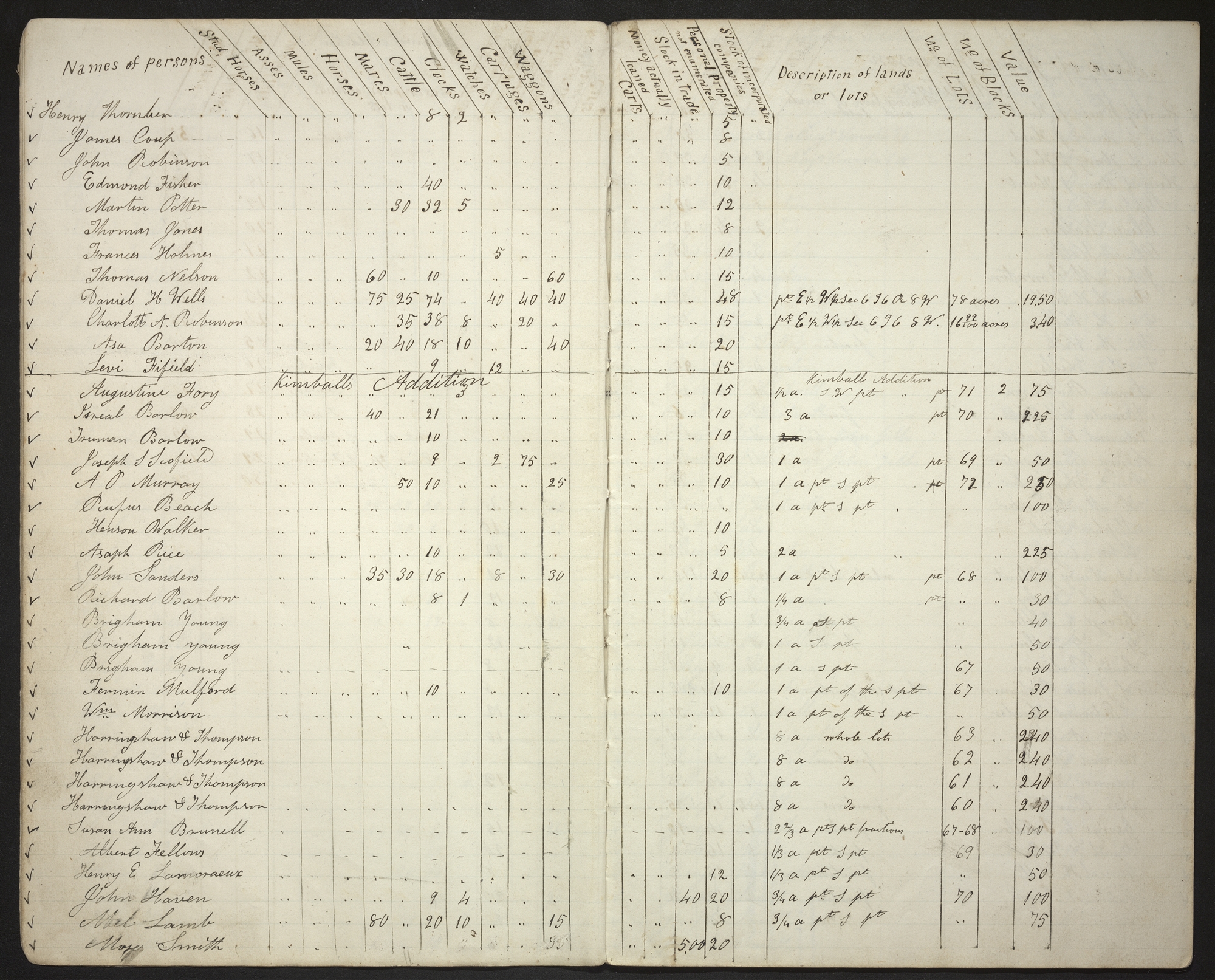 | Names of persons | Stud Horses | Asses | Mules | Horses | Mares | Cattle | Clocks | Watches | Carriages | Waggons | Carts | Money actually loaned | Stock in trade | Personal Property not enumerated | Stock of incorporated companies | Description of lands or lots | No. of Lots | No. of Blocks | Value |