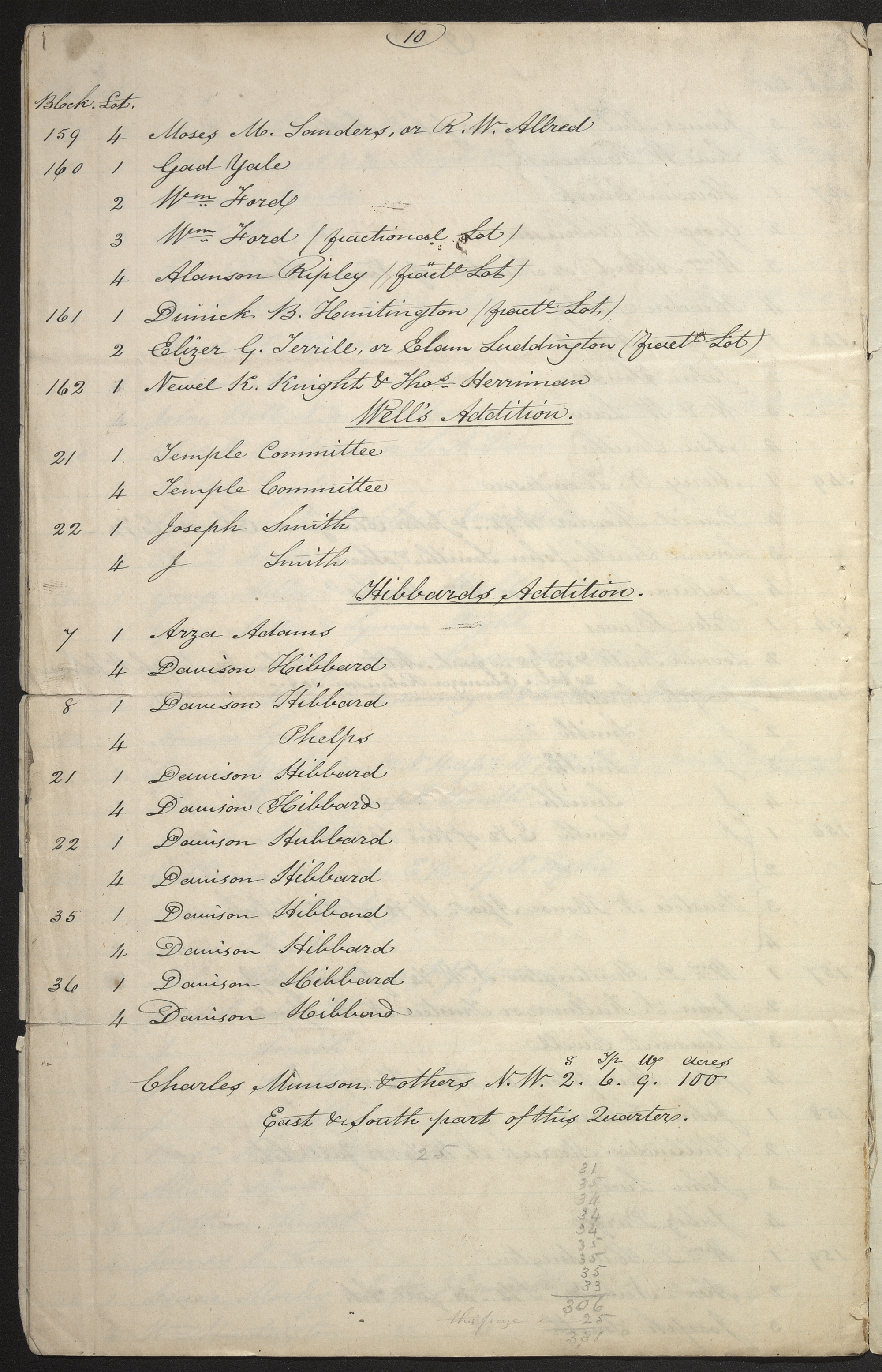 , List of Taxable Lots, second copy for fourth ward; , Hancock Co., IL; between ca. Nov. 1842 and ca. Feb. 1843; handwriting of ; notations in handwriting of and ; docket in handwriting of ; nine pages; Nauvoo, IL, Records, 1841–1845, CHL.