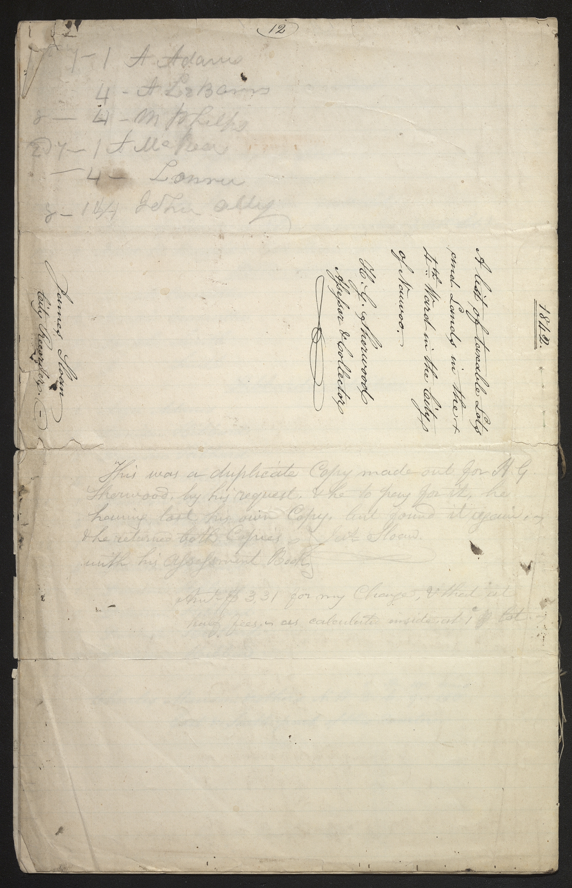 , List of Taxable Lots, second copy for fourth ward; , Hancock Co., IL; between ca. Nov. 1842 and ca. Feb. 1843; handwriting of ; notations in handwriting of and ; docket in handwriting of ; nine pages; Nauvoo, IL, Records, 1841–1845, CHL.