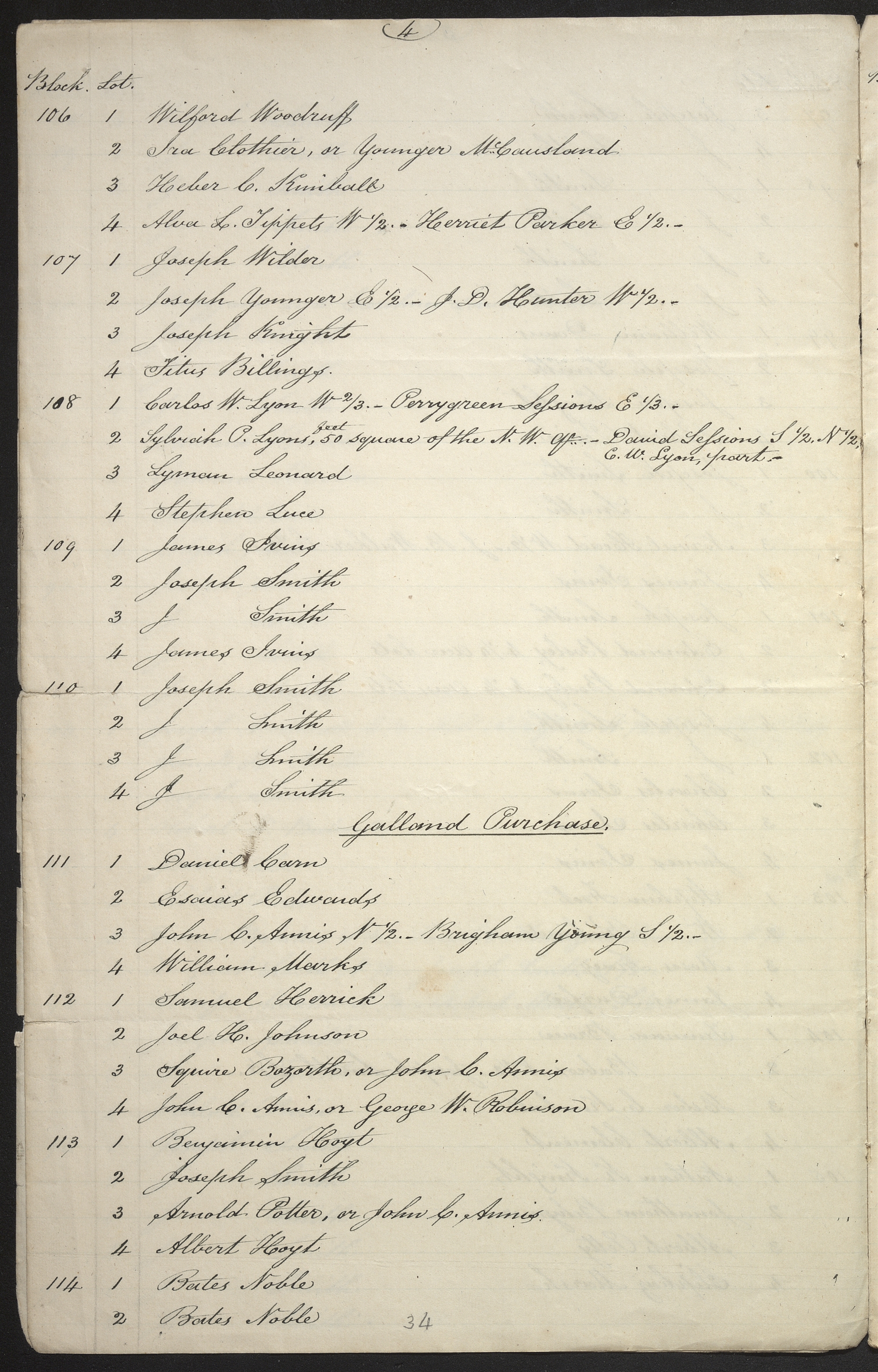 , List of Taxable Lots, second copy for fourth ward; , Hancock Co., IL; between ca. Nov. 1842 and ca. Feb. 1843; handwriting of ; notations in handwriting of and ; docket in handwriting of ; nine pages; Nauvoo, IL, Records, 1841–1845, CHL.