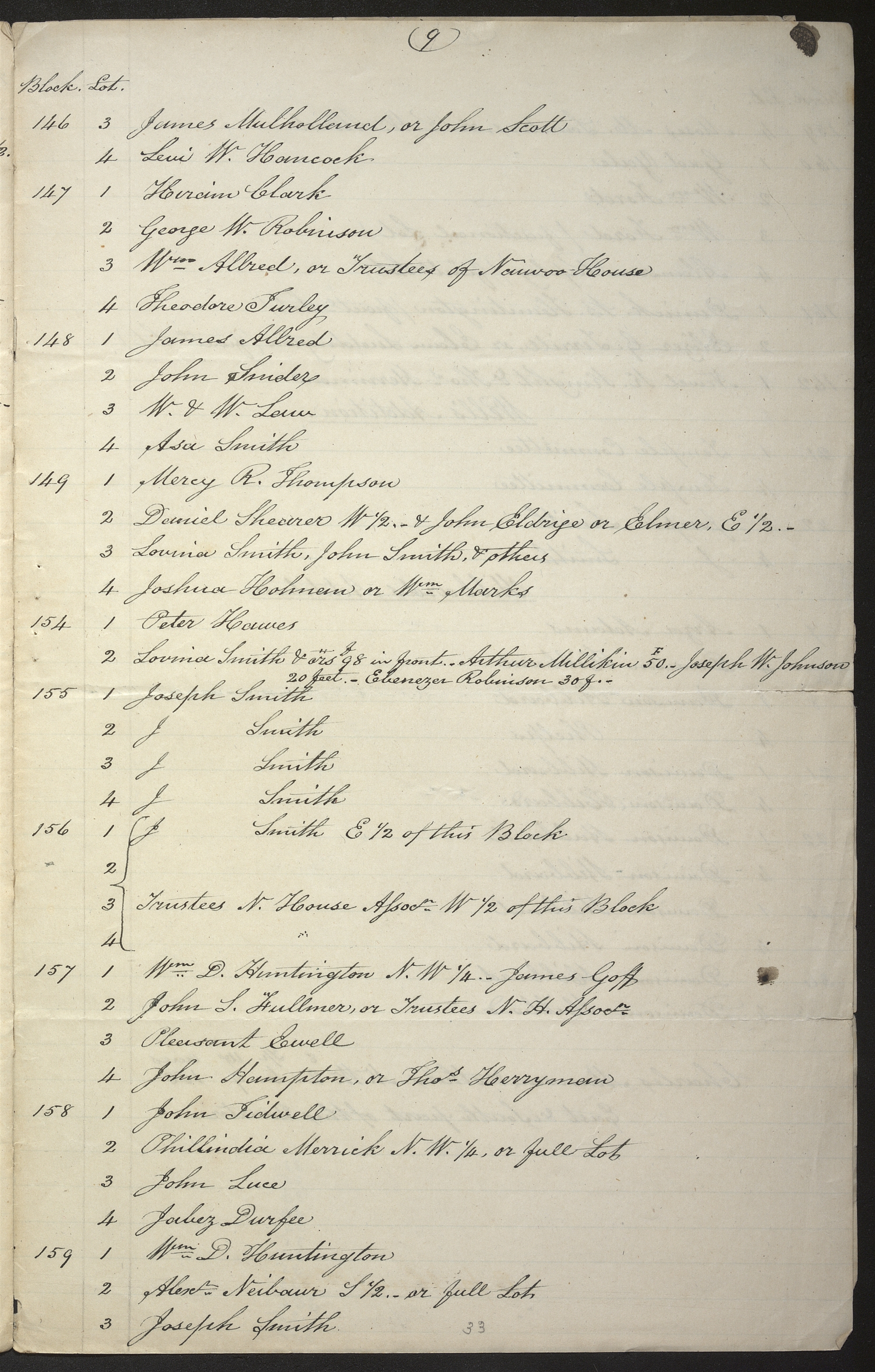 , List of Taxable Lots, second copy for fourth ward; , Hancock Co., IL; between ca. Nov. 1842 and ca. Feb. 1843; handwriting of ; notations in handwriting of and ; docket in handwriting of ; nine pages; Nauvoo, IL, Records, 1841–1845, CHL.