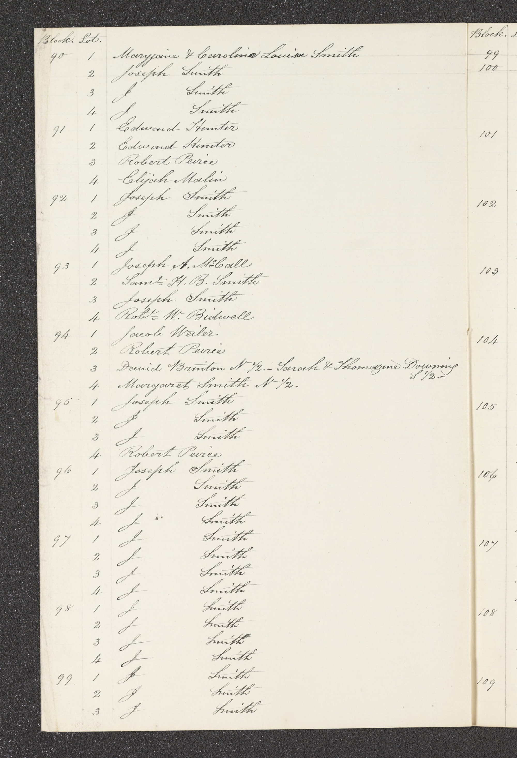 , List of Taxable Lots, copy for fourth ward, Nauvoo, Hancock Co., IL, ca. Nov. 1842; handwriting of ; nine pages; Nauvoo, IL, Records, 1841–1845, CHL.