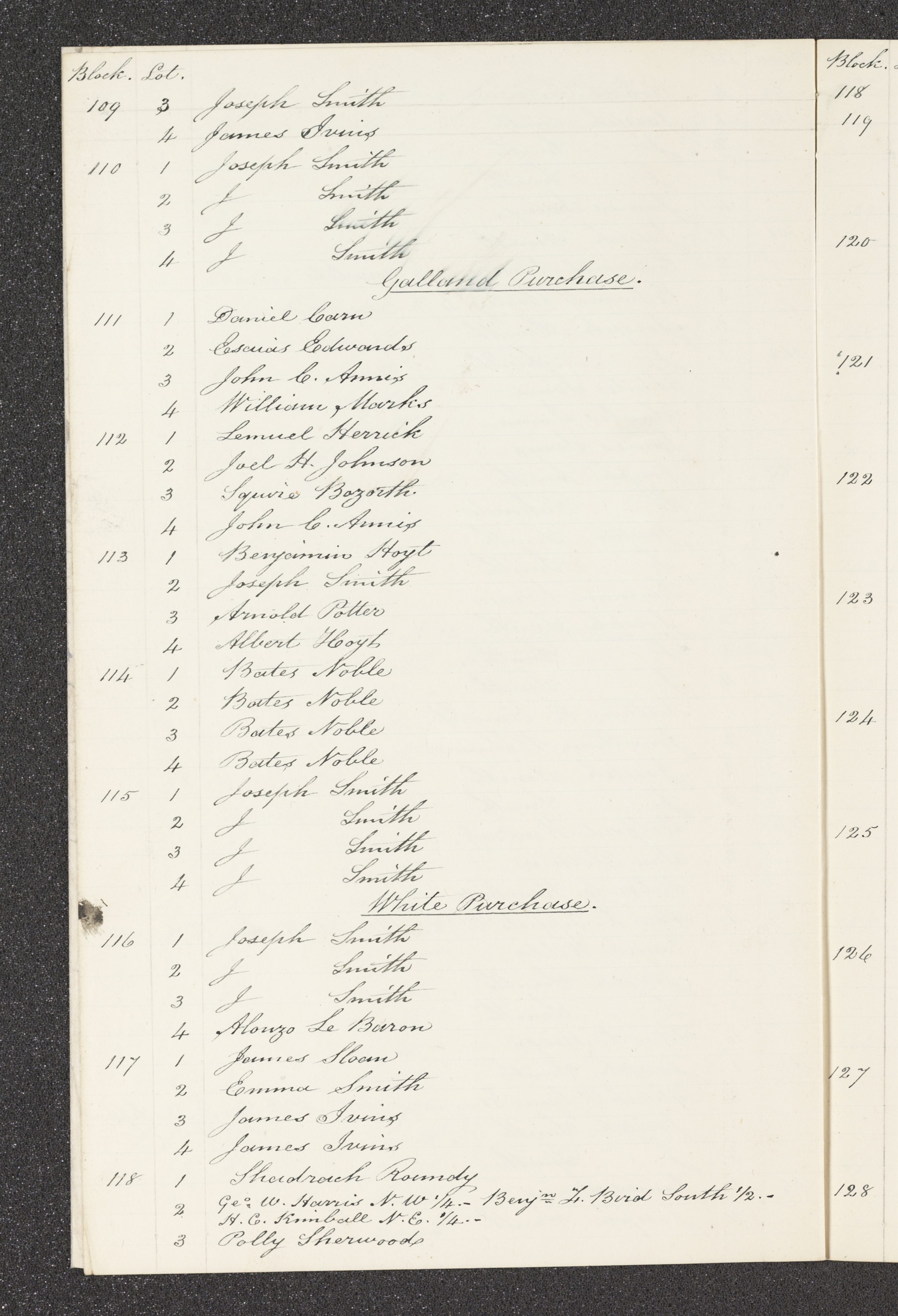 , List of Taxable Lots, copy for fourth ward, Nauvoo, Hancock Co., IL, ca. Nov. 1842; handwriting of ; nine pages; Nauvoo, IL, Records, 1841–1845, CHL.