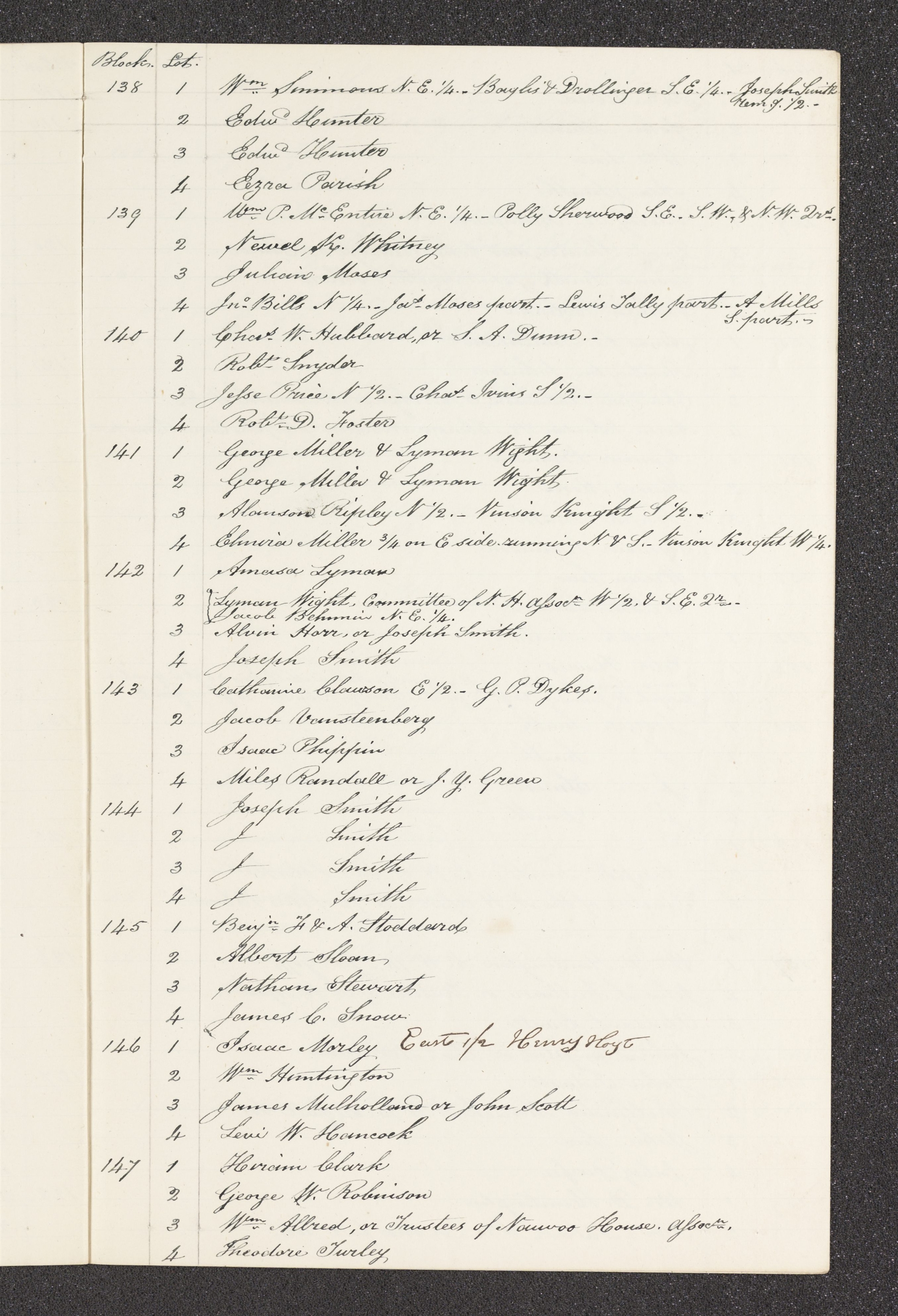 , List of Taxable Lots, copy for fourth ward, Nauvoo, Hancock Co., IL, ca. Nov. 1842; handwriting of ; nine pages; Nauvoo, IL, Records, 1841–1845, CHL.