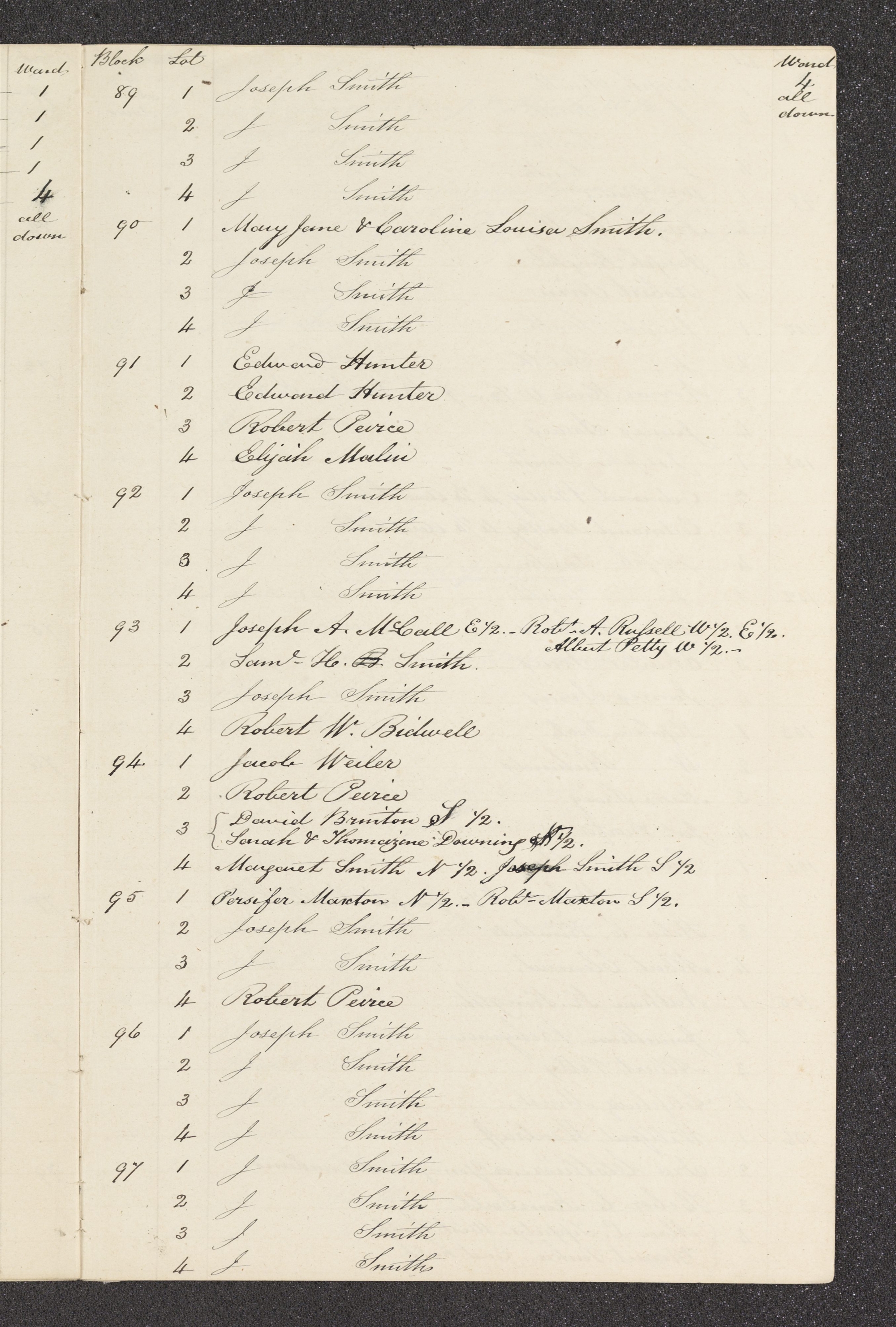 , List of Taxable Lots in Nauvoo, Hancock Co., IL, ca. Nov. 1842; handwriting of and ; sixty-two pages; Nauvoo, IL, Records, 1841–1845, CHL.
