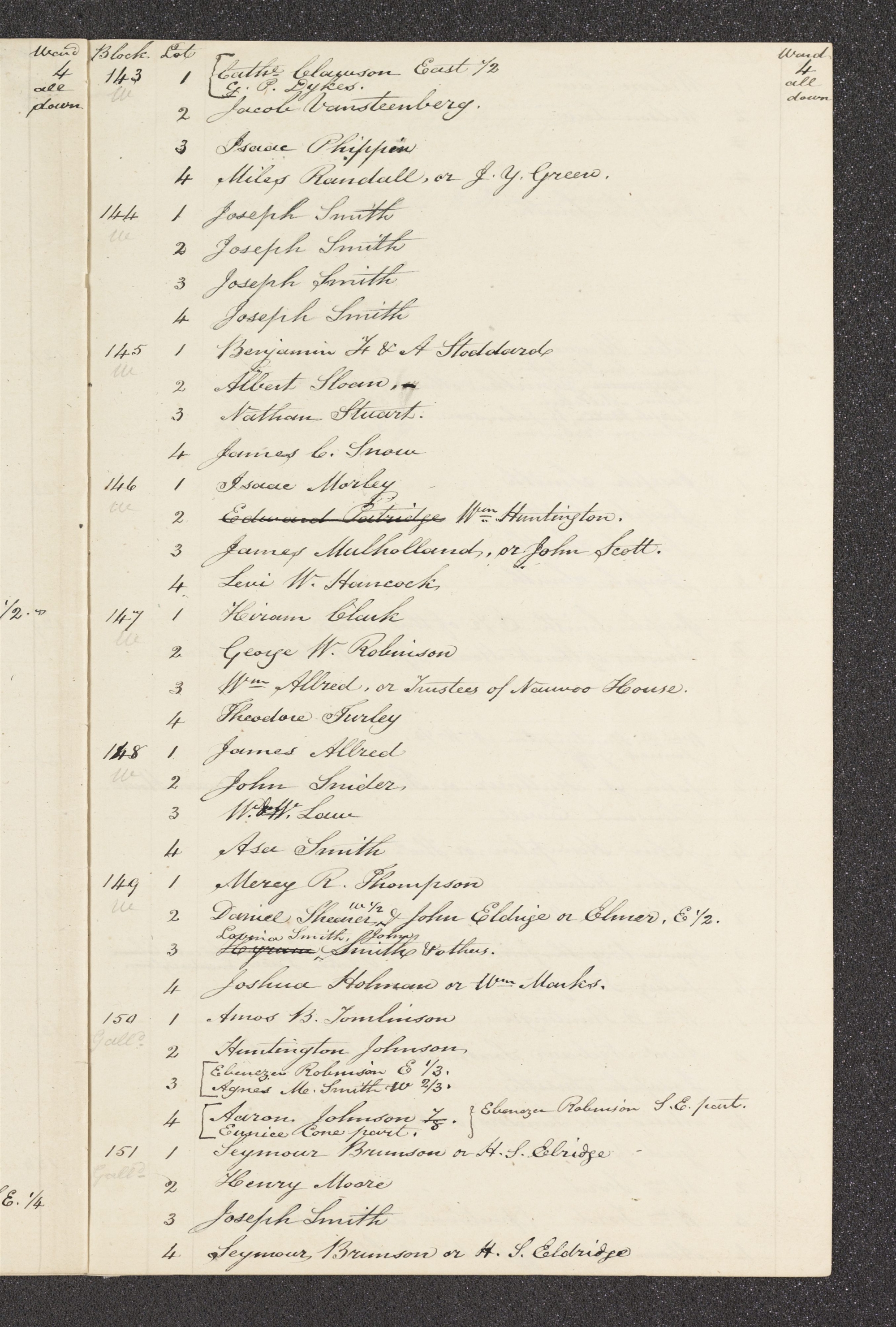 , List of Taxable Lots in Nauvoo, Hancock Co., IL, ca. Nov. 1842; handwriting of and ; sixty-two pages; Nauvoo, IL, Records, 1841–1845, CHL.