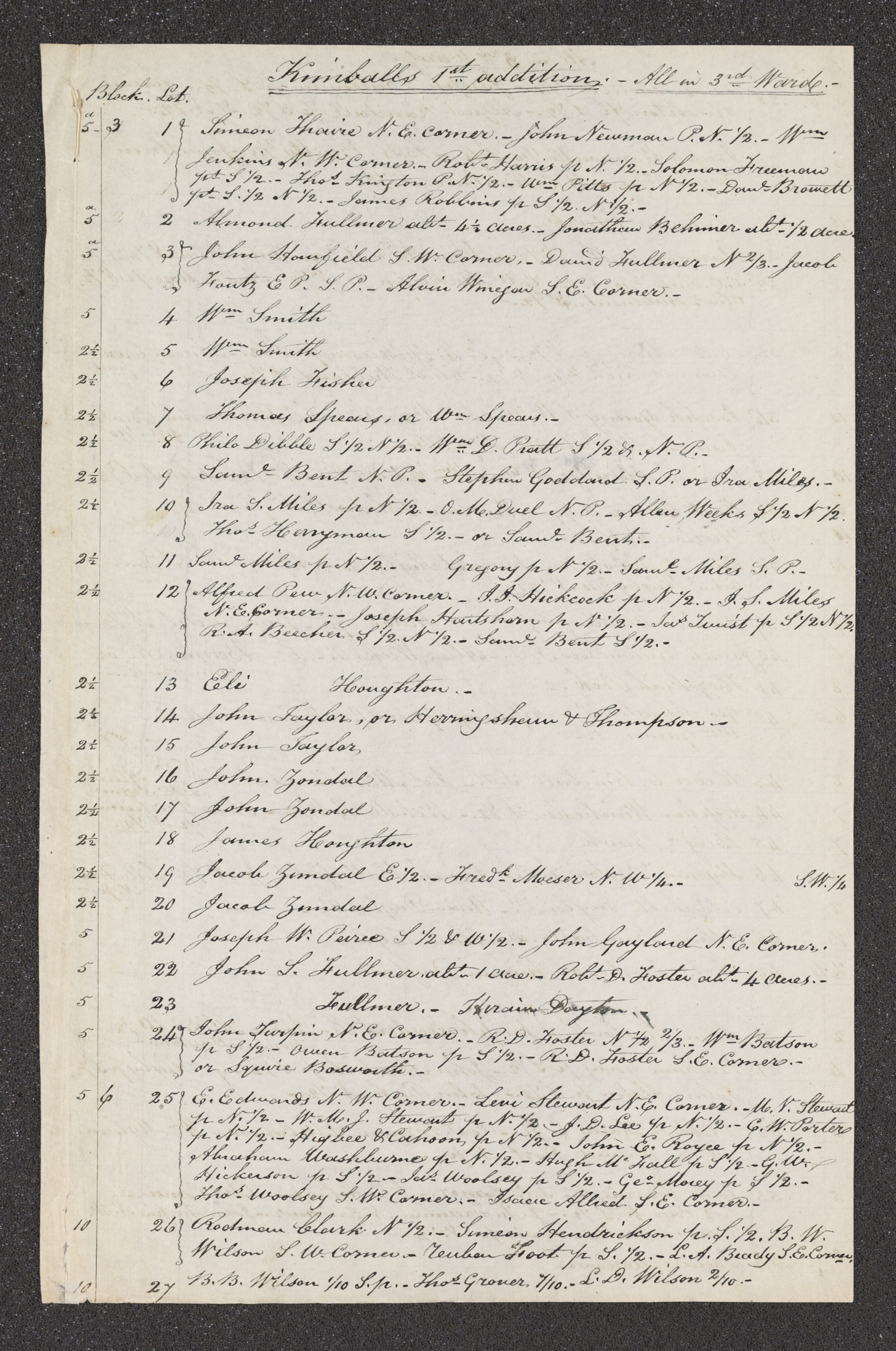 | 2½ | 12 | Alfred Pew N. W. Corner.— J. J. Hickcock [John J. Hickok] p N ½.— N. E. Corner.— p N ½.— p S ½ N ½. S ½. N ½.— S ½.— |