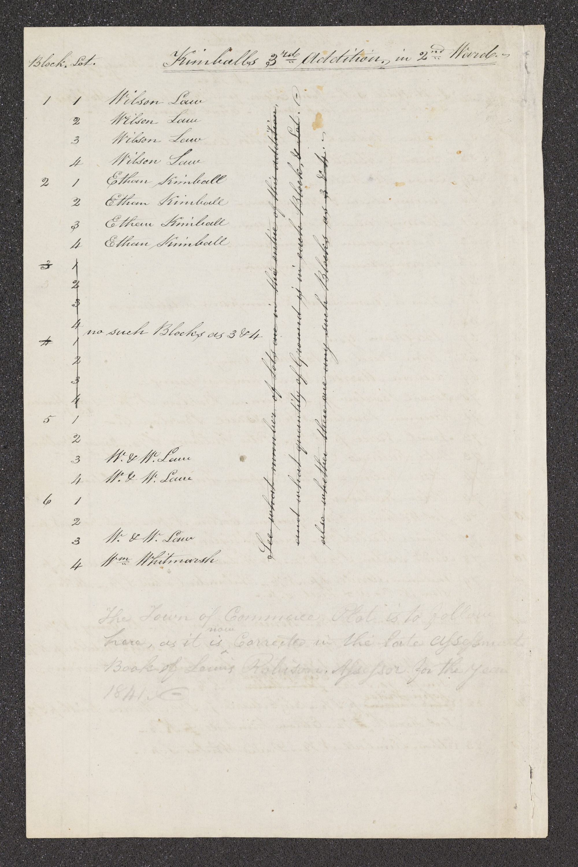 <The Town of Commerce Plot is to follow here, as it is <now> Corrected in the late Assessments Book of Lewis Robison, Assessor for the year 1841.—> [p. [26]]