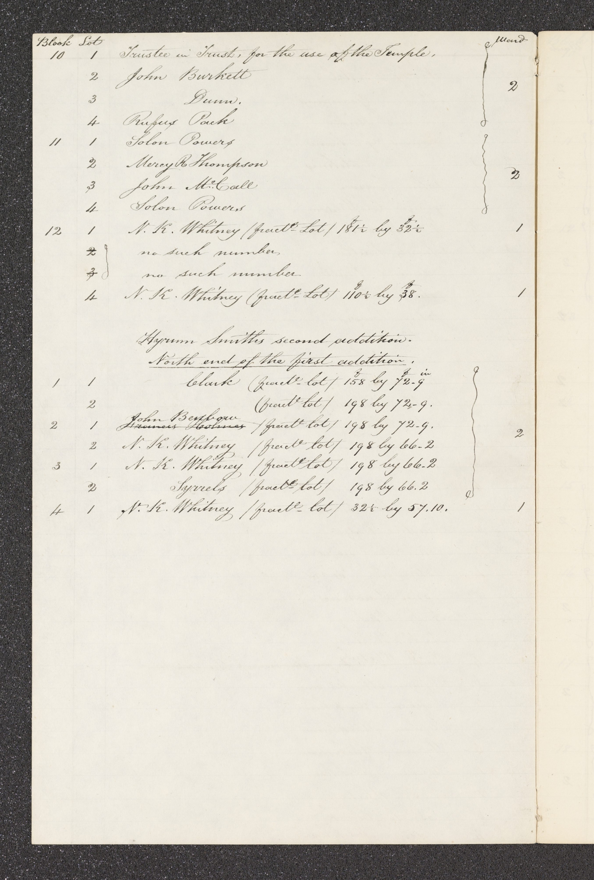 , List of Taxable Lots in Nauvoo, Hancock Co., IL, ca. Nov. 1842; handwriting of and ; sixty-two pages; Nauvoo, IL, Records, 1841–1845, CHL.