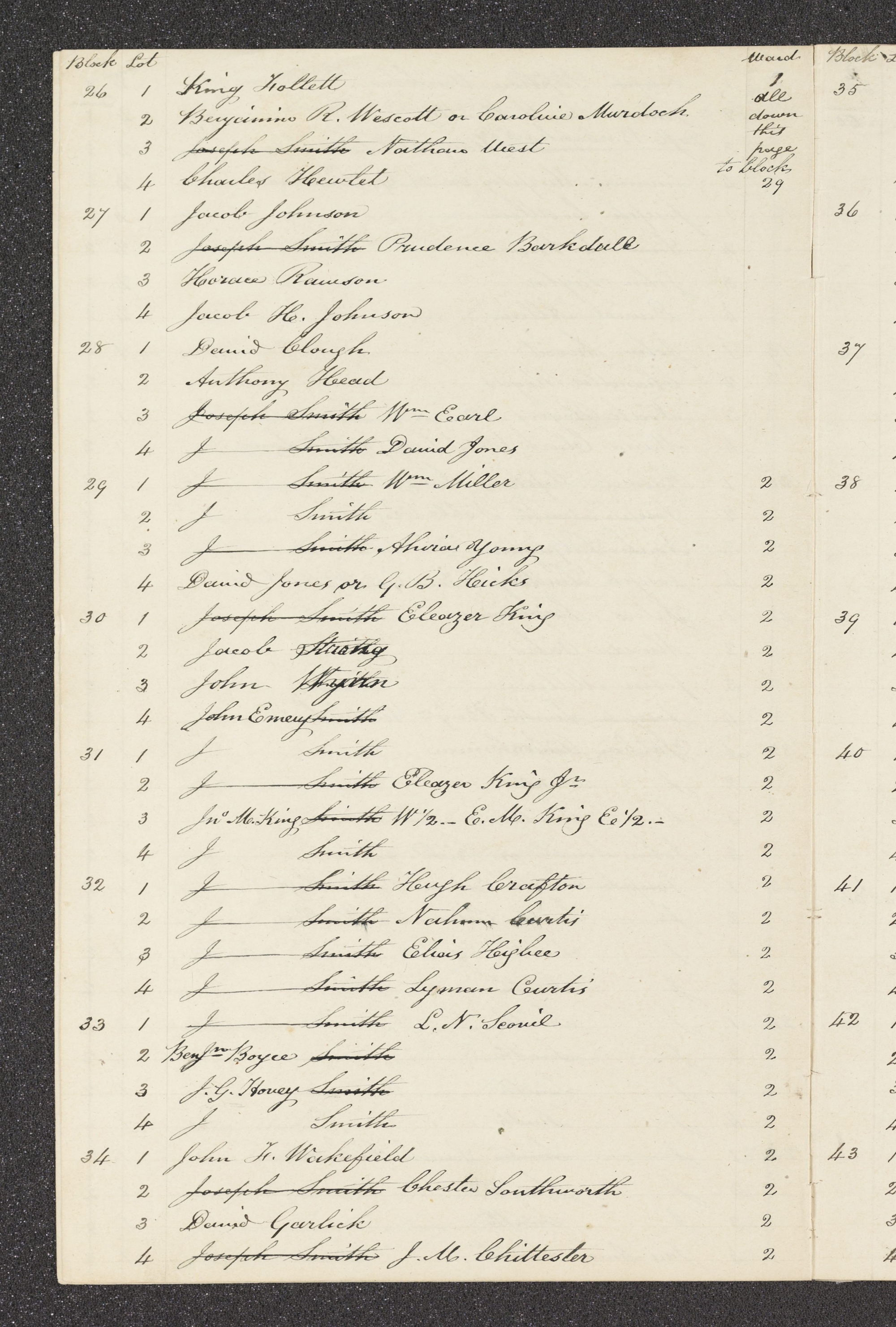 , List of Taxable Lots in Nauvoo, Hancock Co., IL, ca. Nov. 1842; handwriting of and ; sixty-two pages; Nauvoo, IL, Records, 1841–1845, CHL.