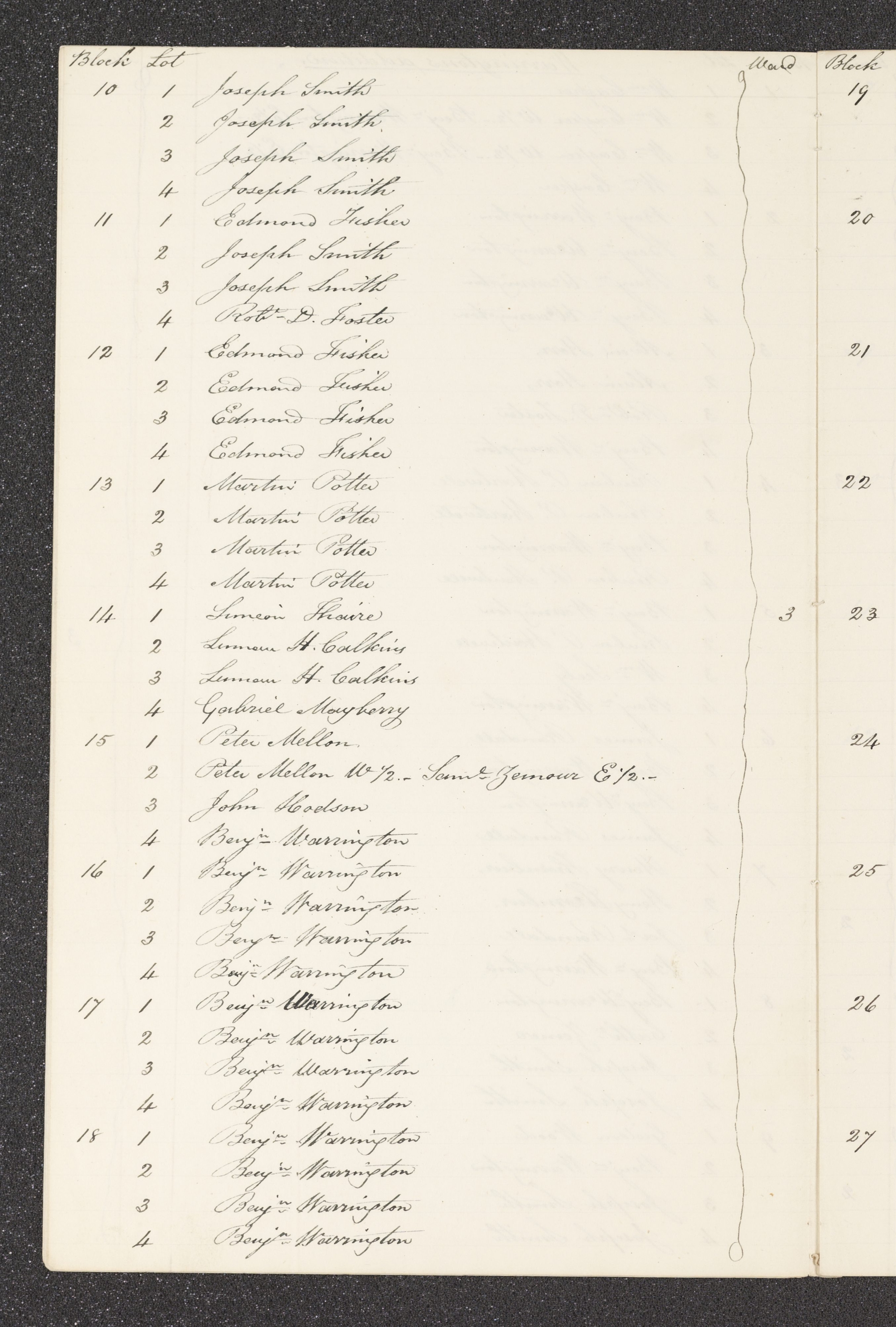 , List of Taxable Lots in Nauvoo, Hancock Co., IL, ca. Nov. 1842; handwriting of and ; sixty-two pages; Nauvoo, IL, Records, 1841–1845, CHL.