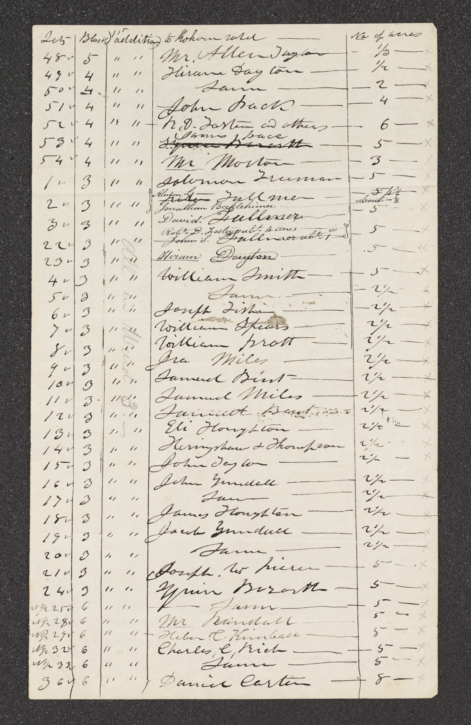, List of Taxable Lots in Nauvoo, Hancock Co., IL, ca. Nov. 1842; handwriting of and ; sixty-two pages; Nauvoo, IL, Records, 1841–1845, CHL.