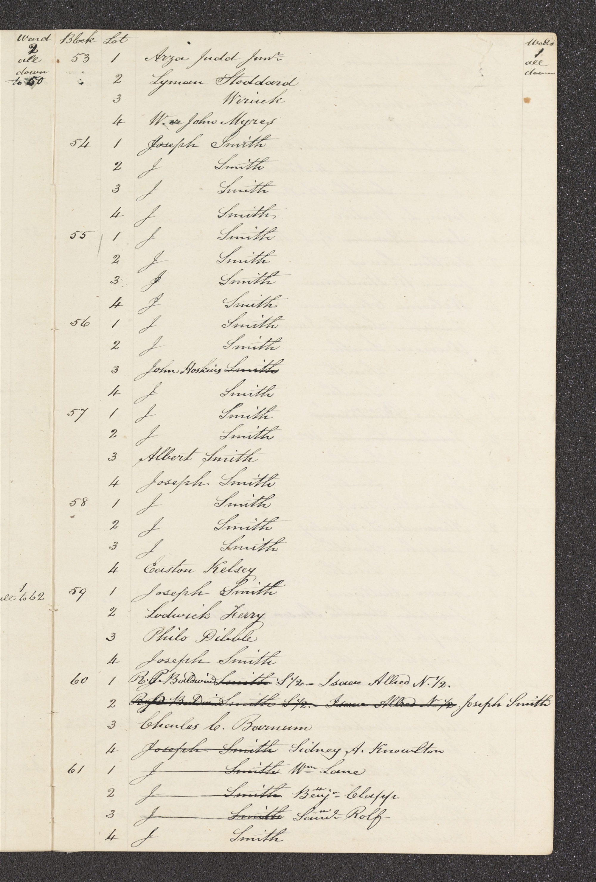 , List of Taxable Lots in Nauvoo, Hancock Co., IL, ca. Nov. 1842; handwriting of and ; sixty-two pages; Nauvoo, IL, Records, 1841–1845, CHL.
