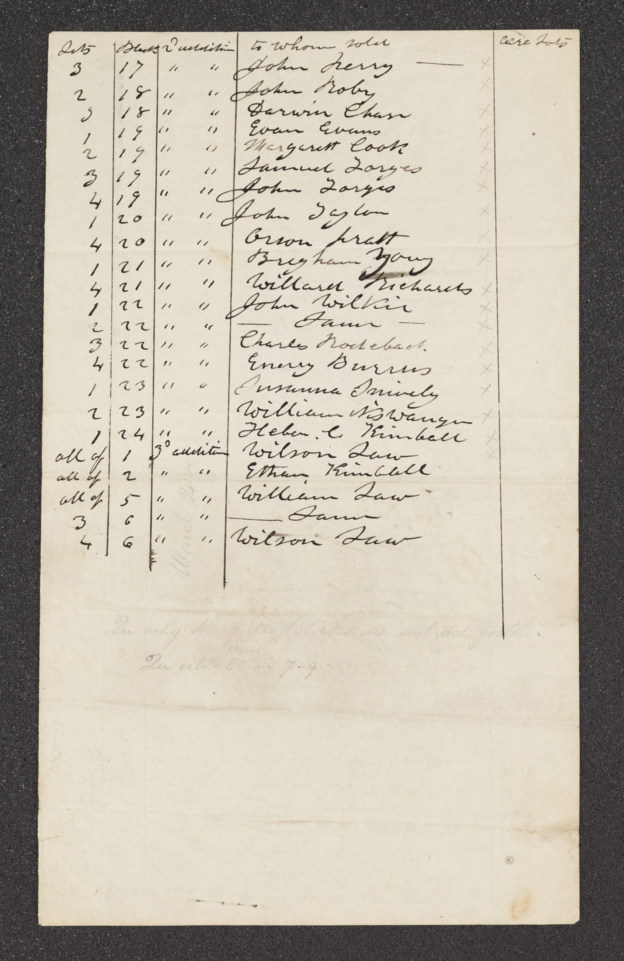 , List of Taxable Lots in Nauvoo, Hancock Co., IL, ca. Nov. 1842; handwriting of and ; sixty-two pages; Nauvoo, IL, Records, 1841–1845, CHL.