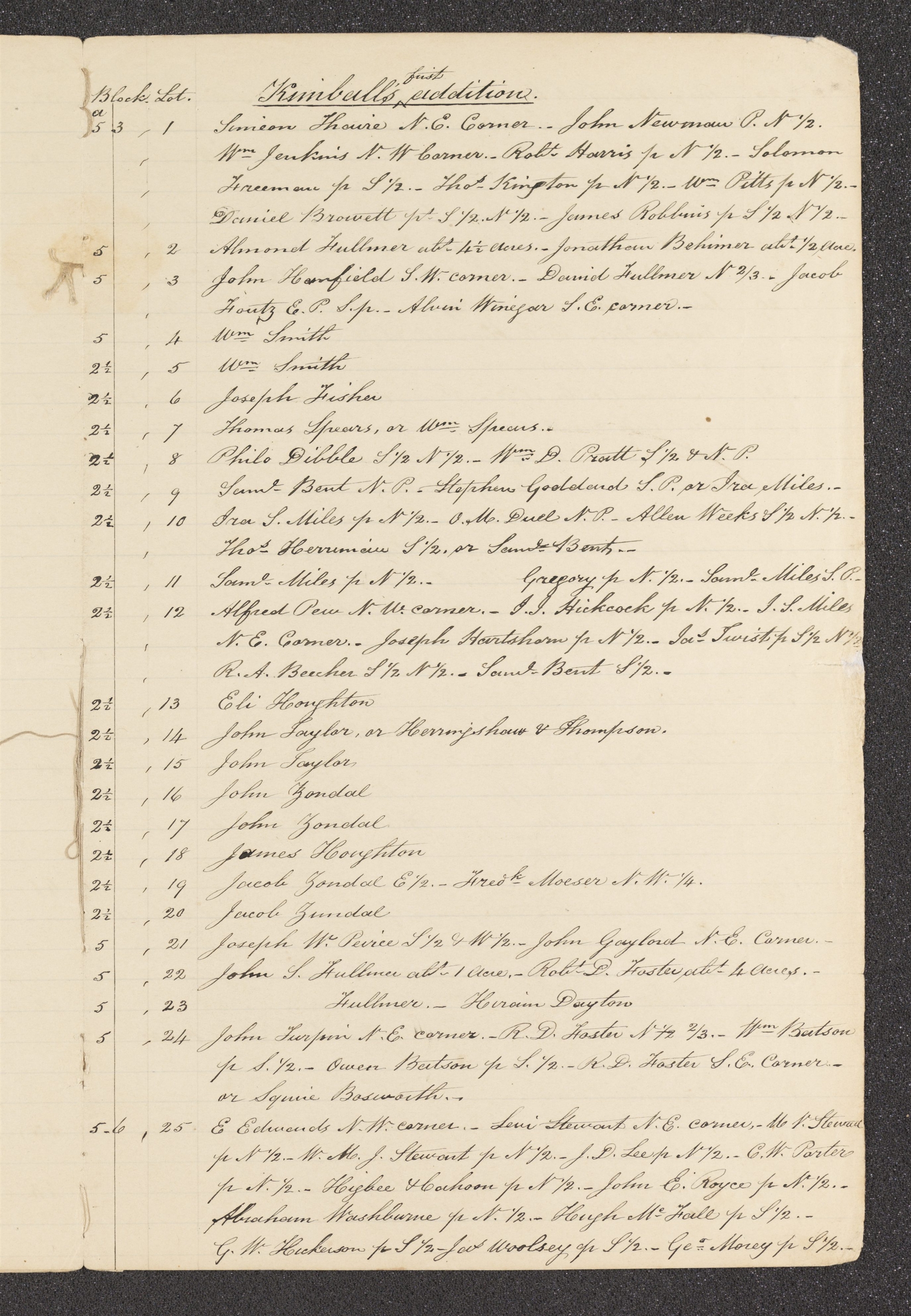 | 2½ | 12 | Alfred Pew N.W. corner.— J. J. Hickcock [John J. Hickok] p N.½.— N.E. Corner.— p N½.— p S½ N½ S½ N½.— S½.— |