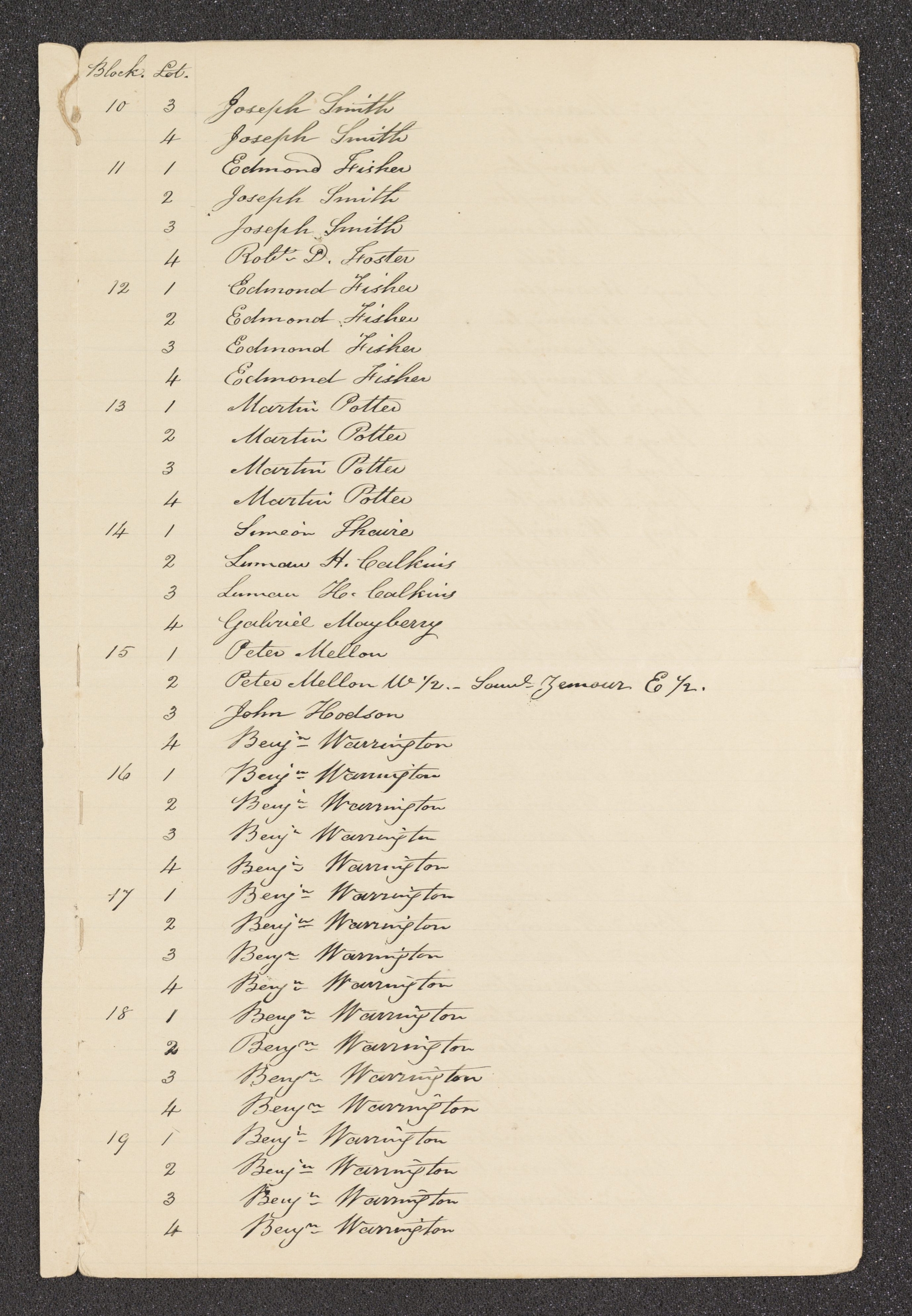 , List of Taxable Lots, copy for third ward, , Hancock Co., IL, ca. Nov. 1842; handwriting of ; sixteen pages; Nauvoo, IL, Records, 1841–1845, CHL.