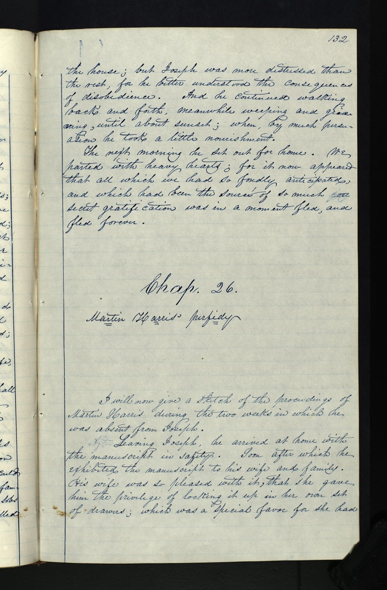 After Leaving Joseph, he arrived at home with the manuscript in safety. Soon after which he exhibited the manuscript to his and family. His was so pleased with it, that she gave him the privilege of locking it up in her own set of drawers; which was a special favor for she had [p. 132]