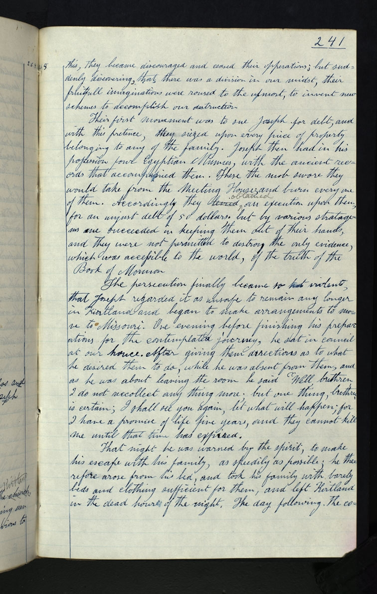 Their first movement was to sue Joseph for debt, and with this pretence, they siezed upon every piece of property belonging to any of the family. Joseph then had in his possession four Egyptian Mum[m]ies, with the ancient records that accompanied them. These the mob swore they would take from the meeting House; and burn every one of them. Accordingly they levied <obtained> an upon them, for an unjust debt of 50 dollars. but by various stratagems one we succeeded in keeping them out of their hands, and they were not permitted to destroy the only evidence, which was accessible to the world, of the truth of the Book of Mormon