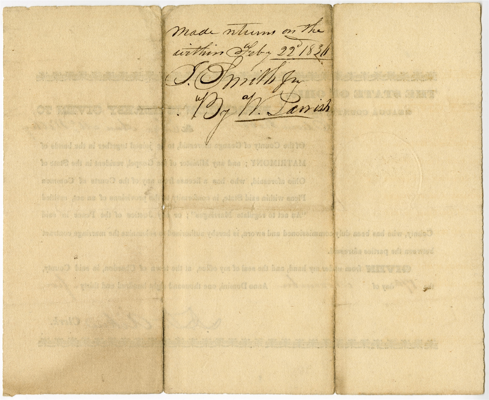Marriage License, for and , Geauga Co., OH, 17 Nov. 1835; printed form with manuscript additions in handwriting of ; one page; Geauga Co., OH, Common Please Court Marriage Licenses, 1835–1836, CHL. Includes endorsement.