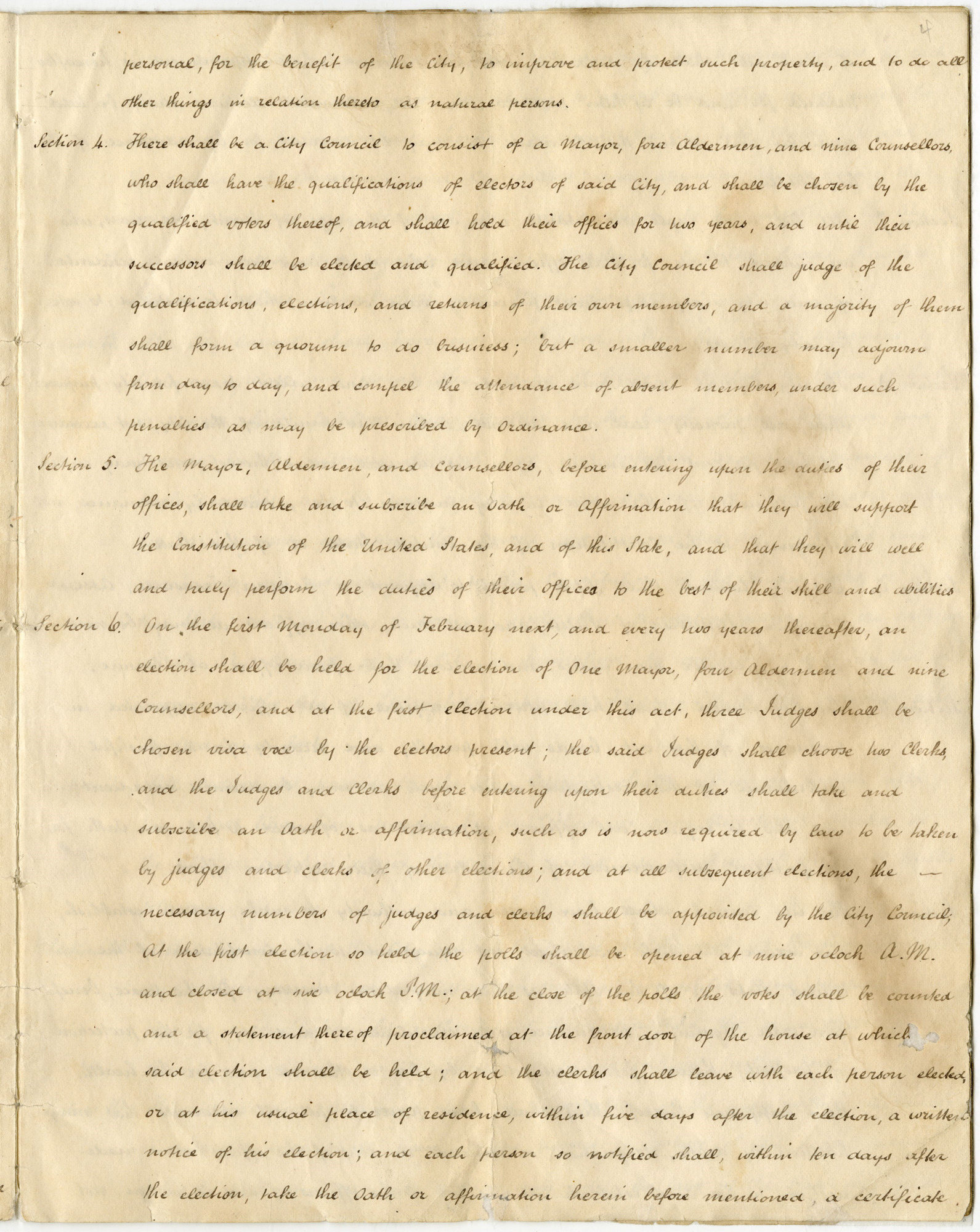 Section 6. On the first Monday of February next, and every two years thereafter, an election shall be held for the election of One Mayor, four Aldermen and nine Counsellors, and at the first election under this act, three Judges shall be chosen viva voce by the electors present; the said Judges shall choose two Clerks, and the Judges and Clerks before entering upon their duties shall take and subscribe an Oath or affirmation, such as is now required by law to be taken by judges and clerks of other elections; and at all subsequent elections, the necessary number of judges and clerks shall be appointed by the City Council; At the first election so held the polls shall be opened at nine oclock A. M. and closed at six oclock P.M.; at the close of the polls the votes shall be counted and a statement thereof proclaimed at the front door of the house at which said election shall be held; and the clerks shall leave with each person elected, or at his usual place of residence, within five days after the election, a written notice of his election; and each person so notified shall, within ten days after the election, take the Oath or affirmation herein before mentioned, a certificate [p. [9]]