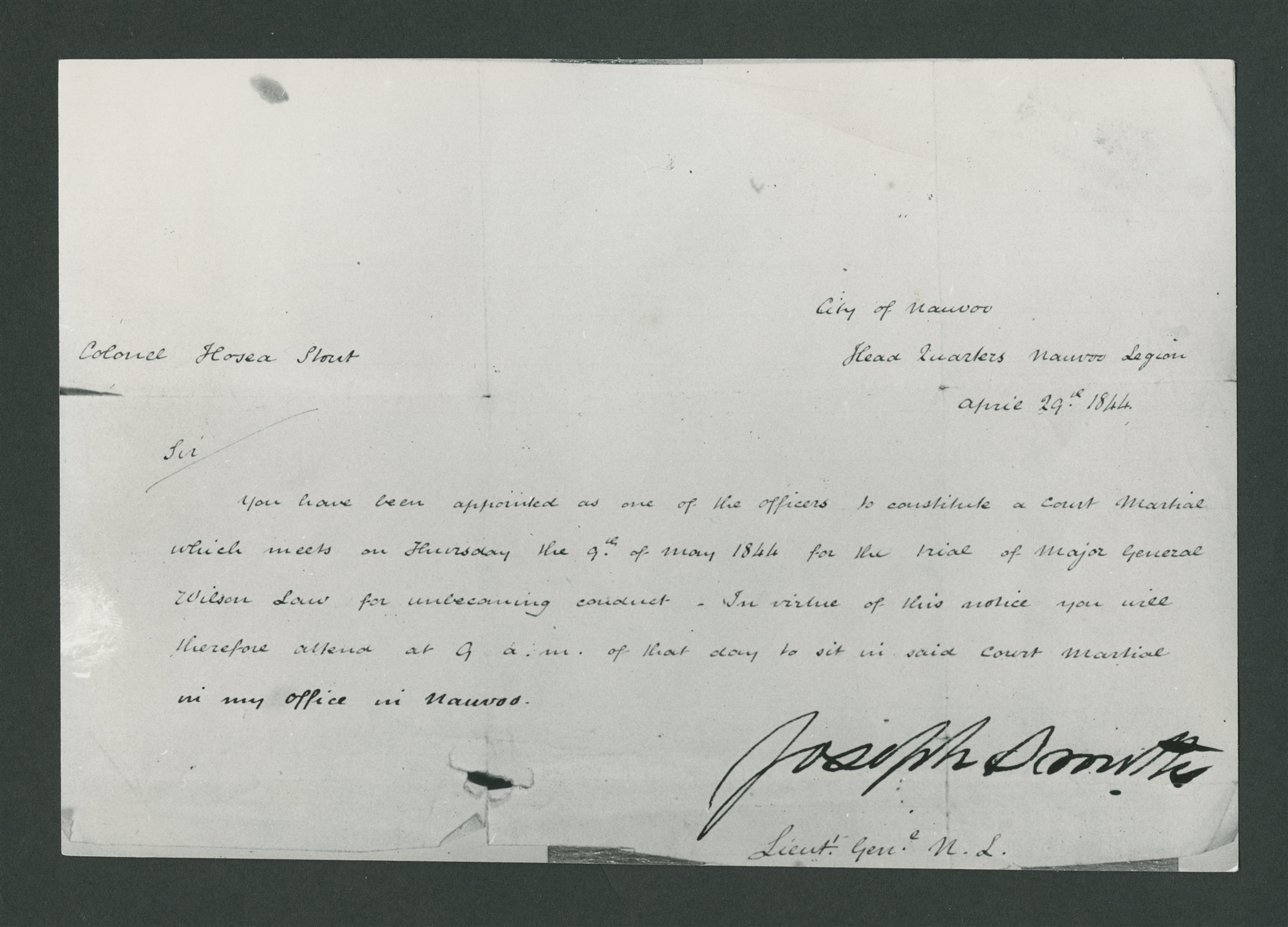JS, Military Order, to , , Hancock Co., IL, 29 April 1844; handwriting of ; signature of JS in the handwriting of ; one page; photocopy of recto in Hosea Stout, Papers, CHL.