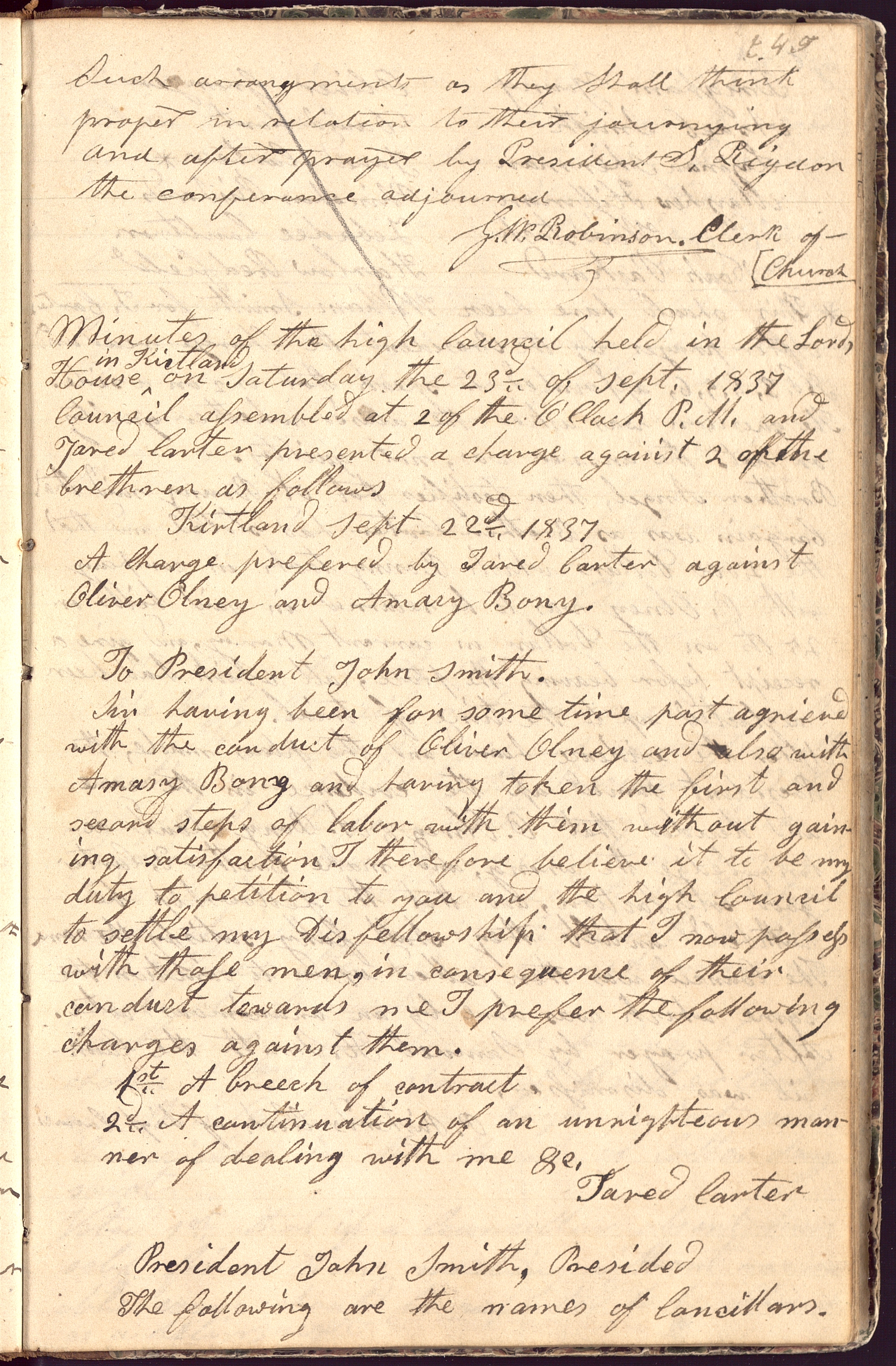 Minutes of the high Council held in the <in > on Saturday the 23d. of Sept. 1837 Council assembled at 2 of the O’Clock P.M. and presented a charge against 2 of the brethren as follows