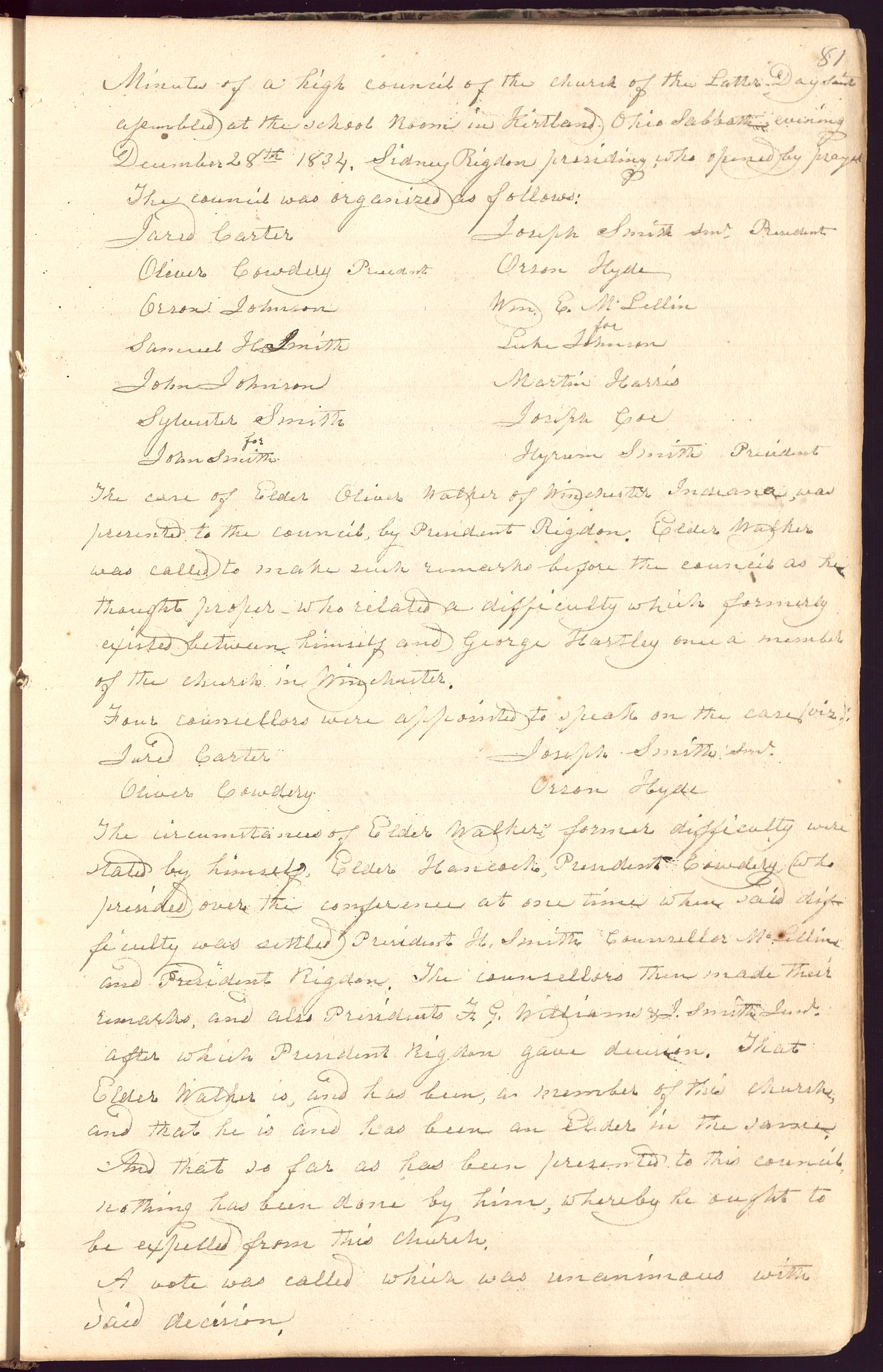 Minutes of a high council of the church of the Latter-Day Saints assembled at the school Room in Ohio Sabbath evening December 28th 1834. presiding, who opened by prayer