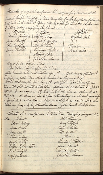 Minutes of a special conference held in Zion July 13, 1832 at the house of in for the purpose of dividing the Church on the land of Zion, into branches for the better convenience of holding meetings & organizing the Church &c.