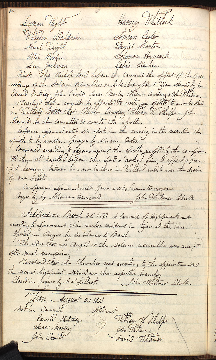 . March 26. 1833. A Council of High priests met according to adjournment 21 in number resident in Zion at this time. Opened in Prayer by Br. .